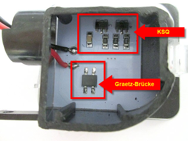 Nicht wirklich überraschend, aber immerhin haben die Chinesen dem Teil eine Graetz-Brücke spendiert (auch bekannt als "Gleichrichter"). Damit erhält man Verpolungssicherheit, sprich es ist egal ob man plus und minus "falsch" aufsteckt, die LEDs werden immer richtig polarisiert. Viel wichtiger als der Montagekomfort dabei ist, das durch dieses Bauteil die beim starten auftretenden Spannungen die LEDs weniger belasten. Denn in Sperrrichtung halten LEDs relativ wenig aus und beim Starten können durchaus nennenswert hohe negative Spannungen auftreten.