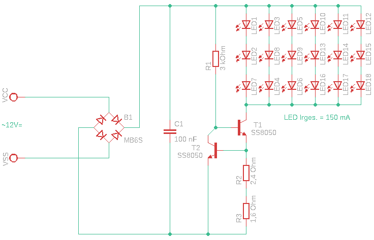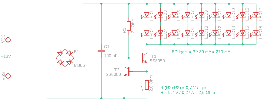 Darüber befindet sich eine recht simple, aber durchaus effektive Konstantstromquelle (KSQ). Da habe ich bei anderen, teils wesentlich teureren LEDs oft genug nur Vorwiderstände gesehen! Das Problem beim Vorwiderstand ist, das man praktisch nur einen Spannungsteiler aufbaut. Da eine LED aber eine recht niedrige Spannung von nur ca. 2-3 V hat (je nach Farbe) aber einen teils recht hohen Strom aufnimmt, muss dieser Widerstand groß dimensioniert sein weil er die "übrige" Spannung in Wärme umwandeln muss. Bei überwachten Lampen geht es nicht anders, weil die Überwachung einen gewissen Stromfluß prüft der nur mit der LED nicht zustande kommt. Zum Glück ist die Umfeldleuchte nicht überwacht ![]()