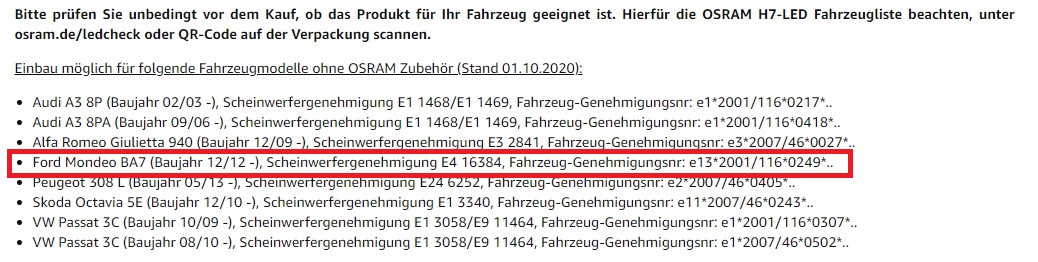 Hab ich im Netz beim stöbern gefunden. Osram hat als erstes die Zulassung das man von der klassischen H7 auf eine LED umrüsten darf. Beim Mondeo BA7 ab BJ12/12. Eintragung ist nicht notwendig. Man braucht nur von Osram eine Bestätigung welche man auf deren Seite bekommt und ein Aufkleber muss am Fahrzeug angebracht werden. Der wird wohl dann mit den Birnen geliefert. Umrüstung ist ohne Aufwand zu erledigen. Einfach wie gewohnt wechseln. Hier der Link zum Bericht
