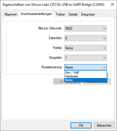 Schau doch mal in die Einstellungen vom Treiber. Bei mir steht bei Flussteuerung nämlich "Keine" und so sollte es auch sein, denn sonst werden die Handshake-Leitungen vom Treiber gesteuert und nicht von unserem Terminalprogram: