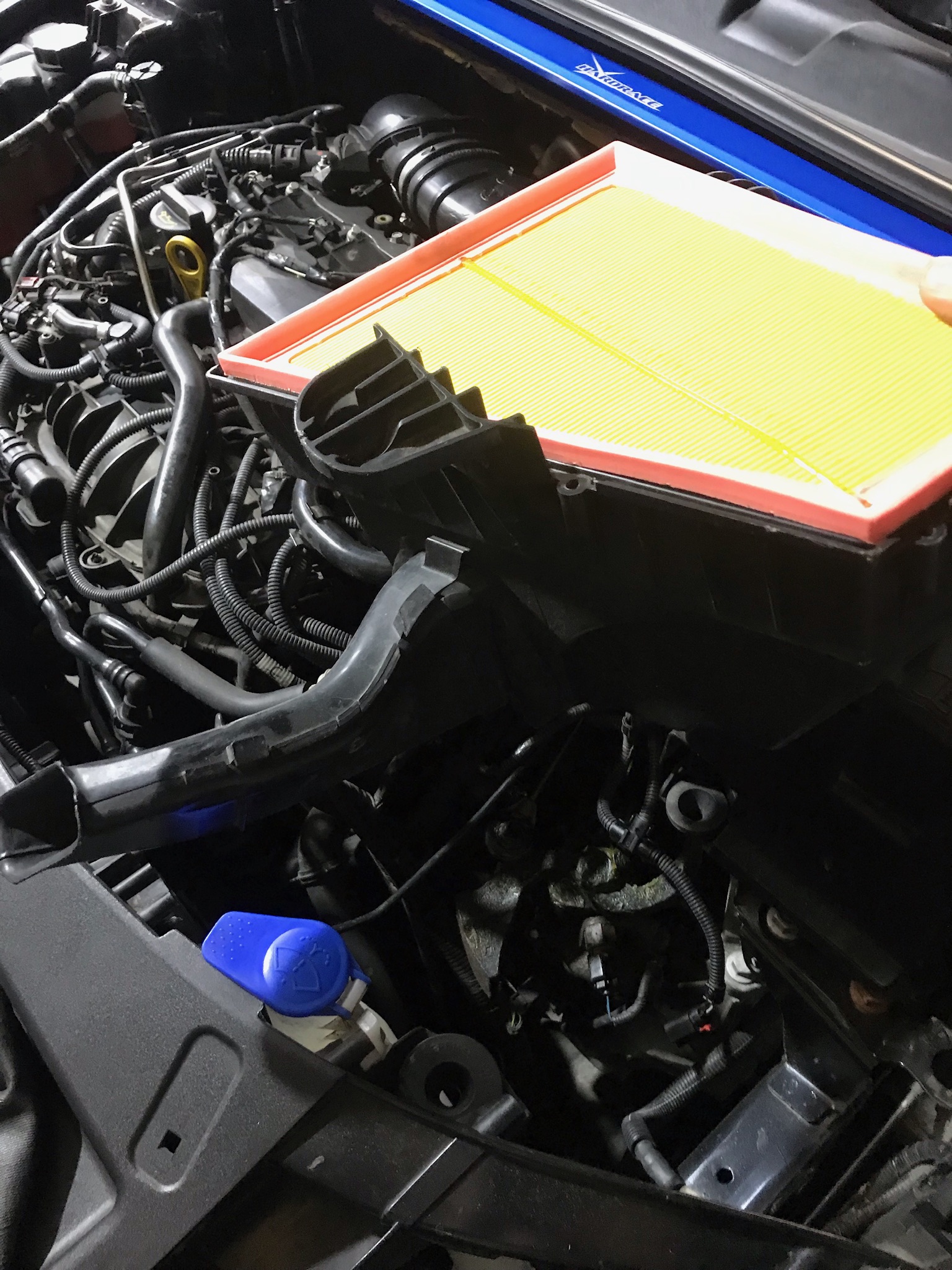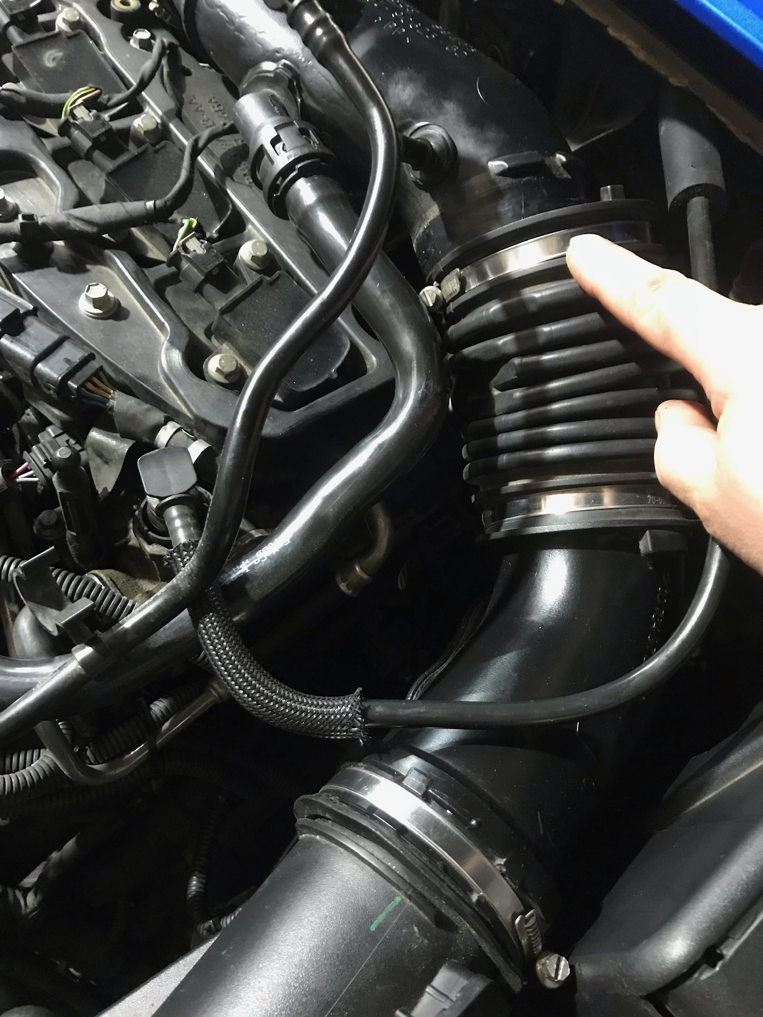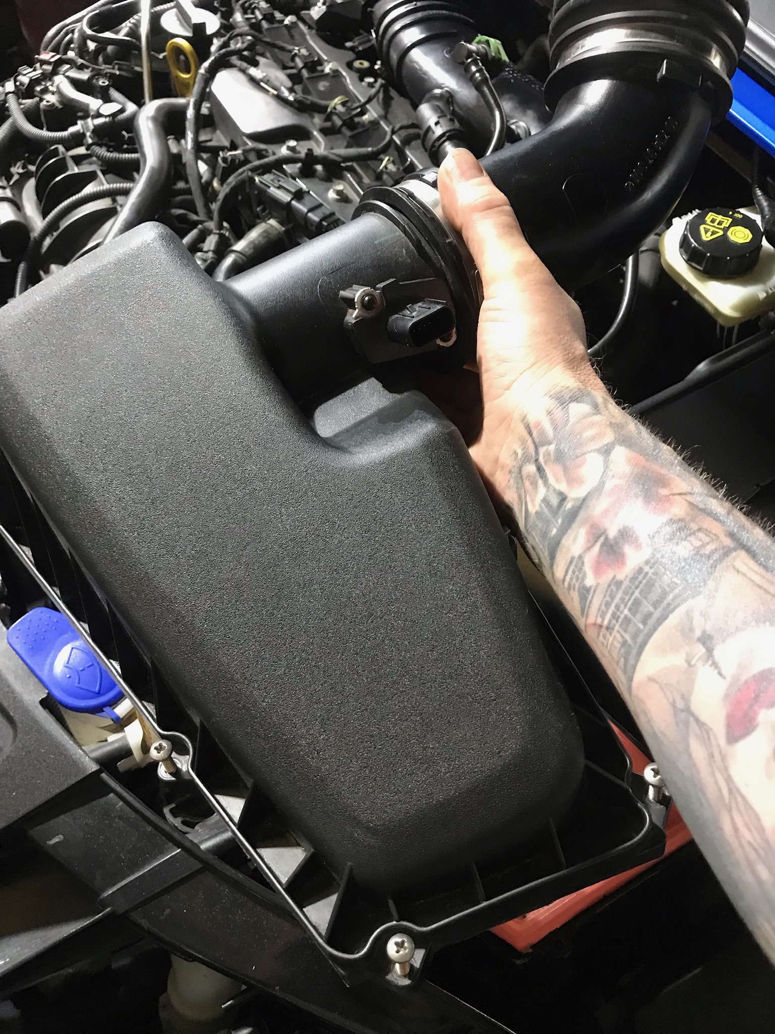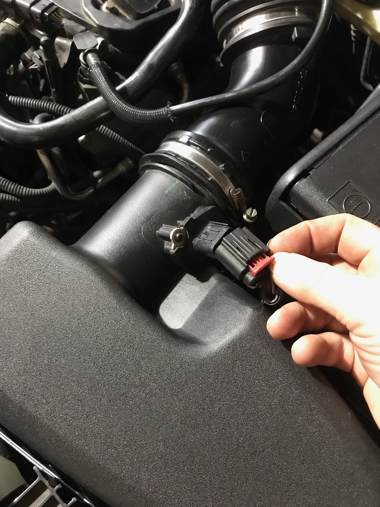 - Luftfilterkasten am besten raus, Deckel ab und Schlauch trennen, Kabel vom Sensor ab und das Unterteil aus den Gummipuffern rausheben