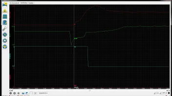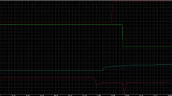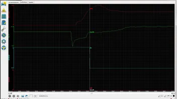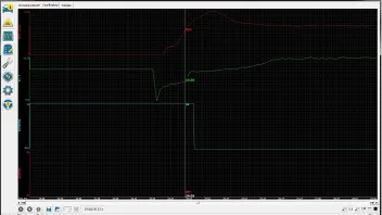 ungefähr ab diesem Zeitpunkt startet der Motor. Der Anlasser muss nun den Motor nicht mehr durchdrehen, die Stromaufnahme sinkt sehr weit ab und die Batteriespannung steigt schnell auf fast den Wert wie vor dem Anlassen