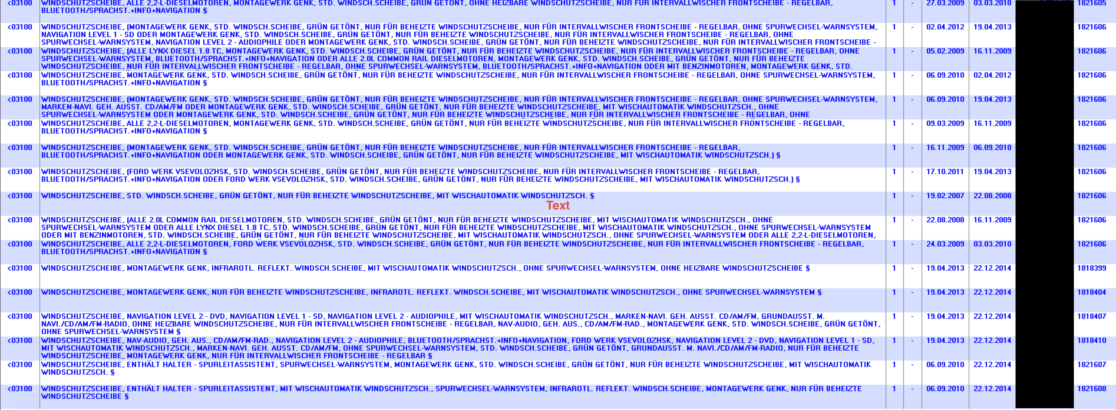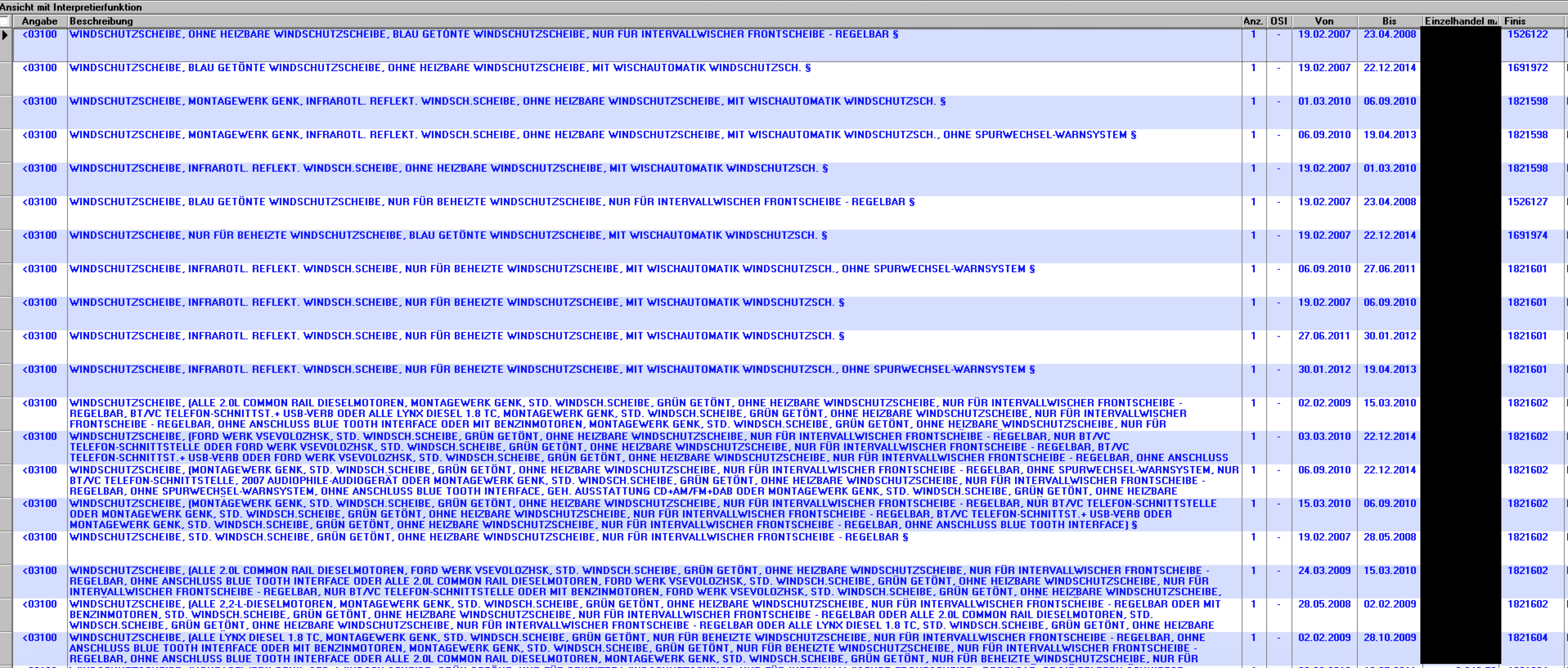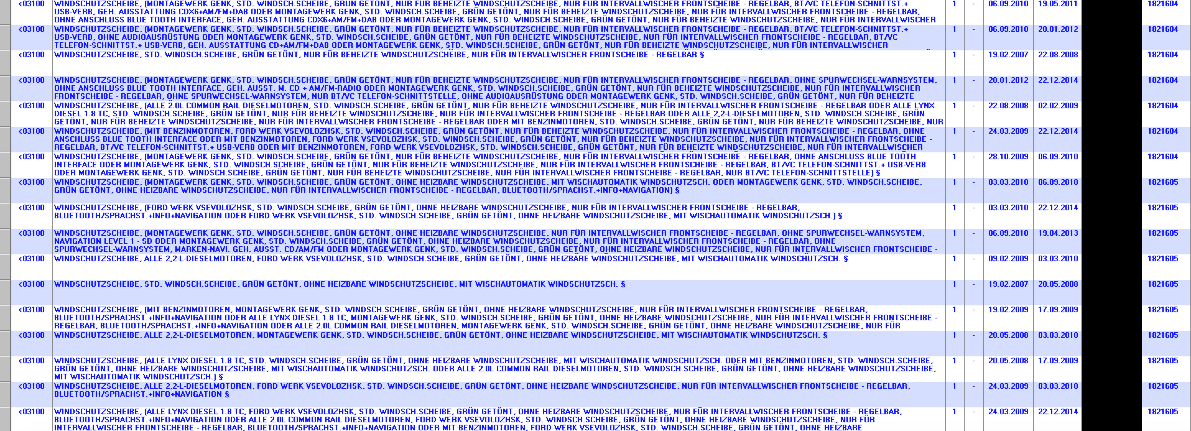 Eine Angaben in diesen Teilelisten machen auch vordergründig keinen Sinn. Da liest man im Zusammenhang mit der WSS so Dinge wie "Montagewerk Genk" oder "Alle Lynx Diesel 1.8 TC" oder "Bluetooth/Sprachst.+Info+Navigation". Ich denke das entsteht so das sich Ford ein Paket ausdenkt und in diesem ist dann eine bestimmte Scheibe enthalten. Dafür wird dann ein Eintrag hinterlegt. Die Scheibe kommt so aber auch noch in zig anderen Paketen vor. Das muss man einfach nur wissen bzw. ignorieren.