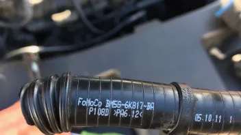 • so viel ist da nicht zum abknicken. Unter dem Auto Metall, dann kommt ein Knick mit Gummi, hoch zum Motor, dann Metall hoch zum Kopf, abknickend mit Gummi nach vorne, dann an der Zahnriemenseite um den Ventildeckel herum in Metall und die Knicke aus Gummi, rein in die Benzinhochdruckpumpe. Alles abgefummelt bei laufenden Motor und mit Drehzahl. Nix. Das einzigste was stinkt ist der Schlauch der vom Ölabscheider hochkommt. Muß wohl doch zum Fordhändler mal. Rot ist die Spritleitung und gelb ist die Tankentlüftung die von hinten kommt.