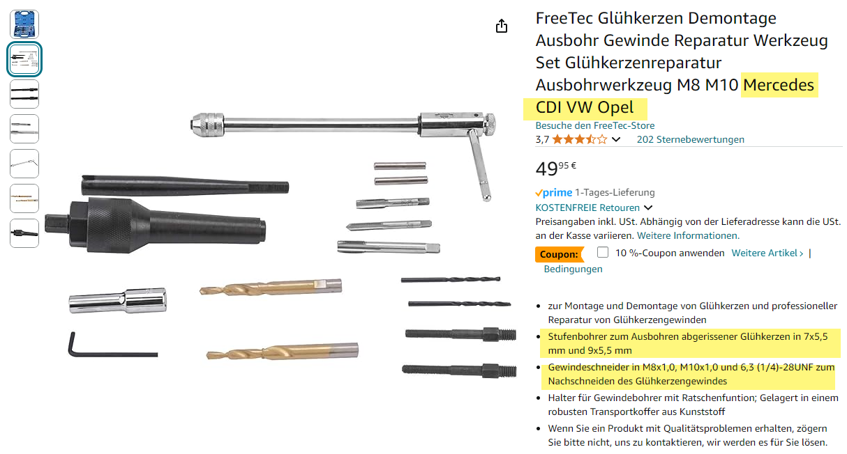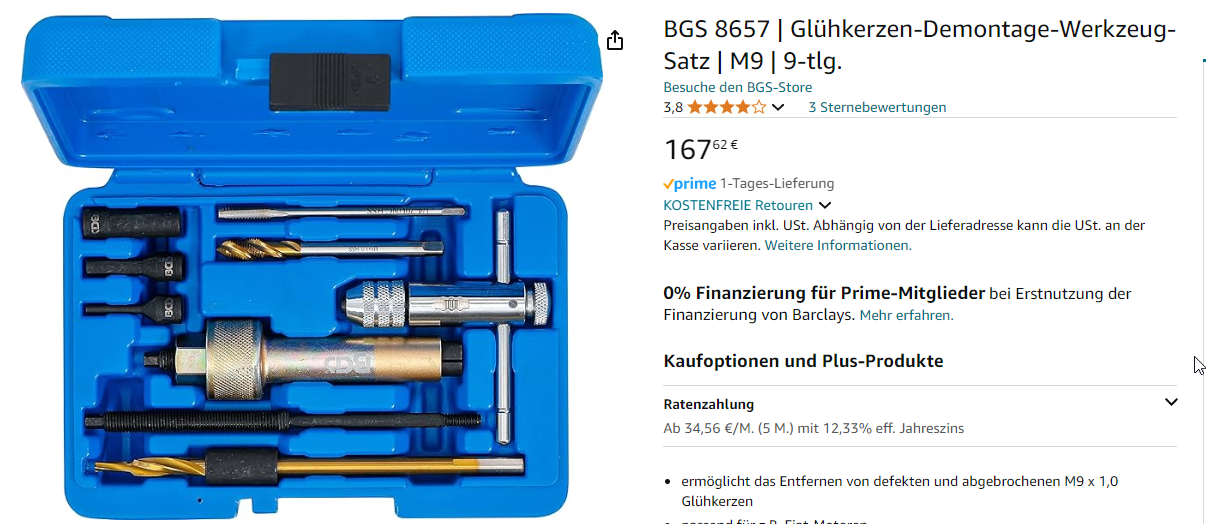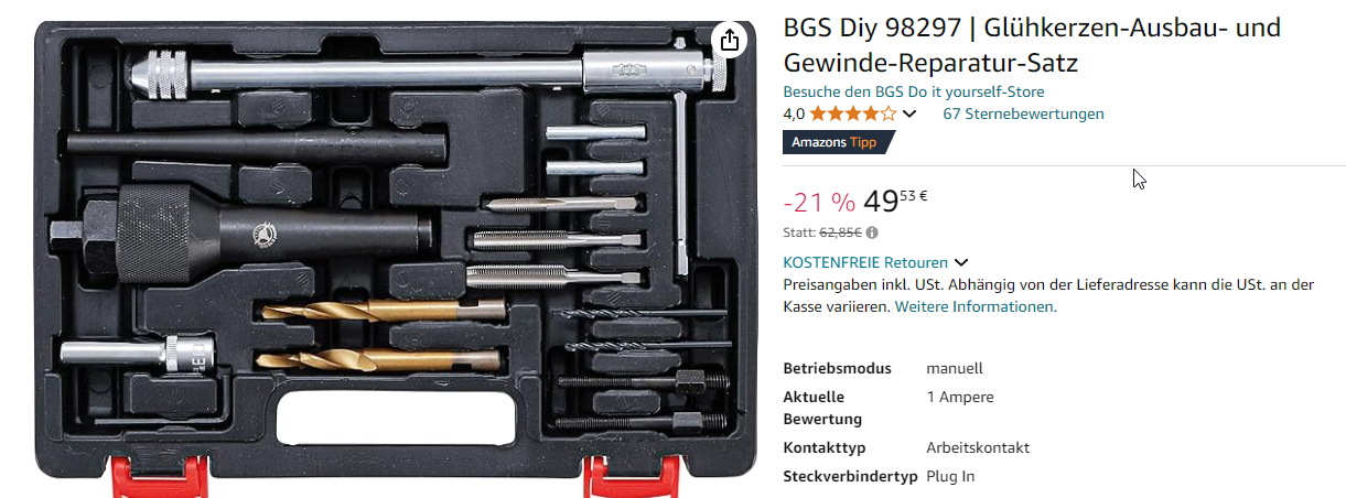 Und dann gibt es doch auch noch die mit Schlaghammer? So ein kompletter Satz von BGS oder ähnlichen kostet so um die 50,- bis 100,- €, gibt natürlich auch noch teurere. Da ist dann oft auch Ausbohrwerkzeug mit dabei. Man sollte sicher drauf achten das dort auch 8mm Werkzeug vorhanden ist, denn andere Fahrzeugmodelle haben deutlich größere Glühkerzen. In diesem Fall hier sind Gewindeschneider dabei, aber wenn man ausbohrt muss man ja aufs nächst größere Gewinde gehen, also vermutlich gleich M10?