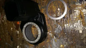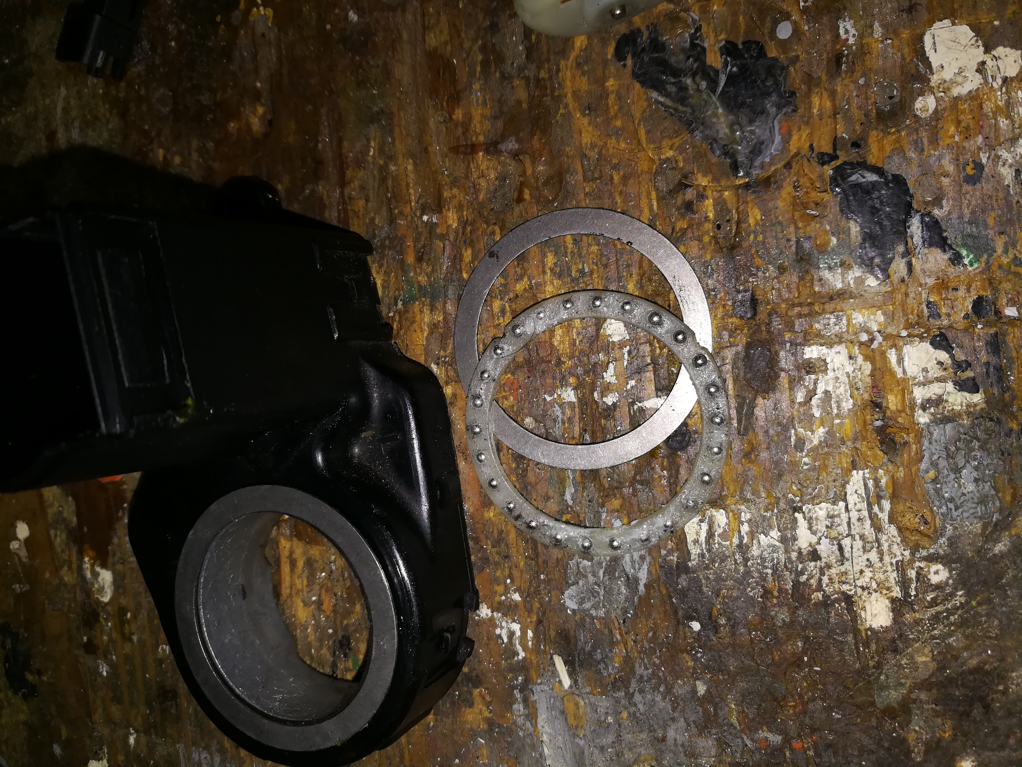 Das Axial- Lager hat einen Durchmesser von 36.8mm und hat auch einen entsprechenden Lagersitz im Gelenkarm des Spiegels! ( Originalteil !) und es ist nicht im Guss eingebaut!