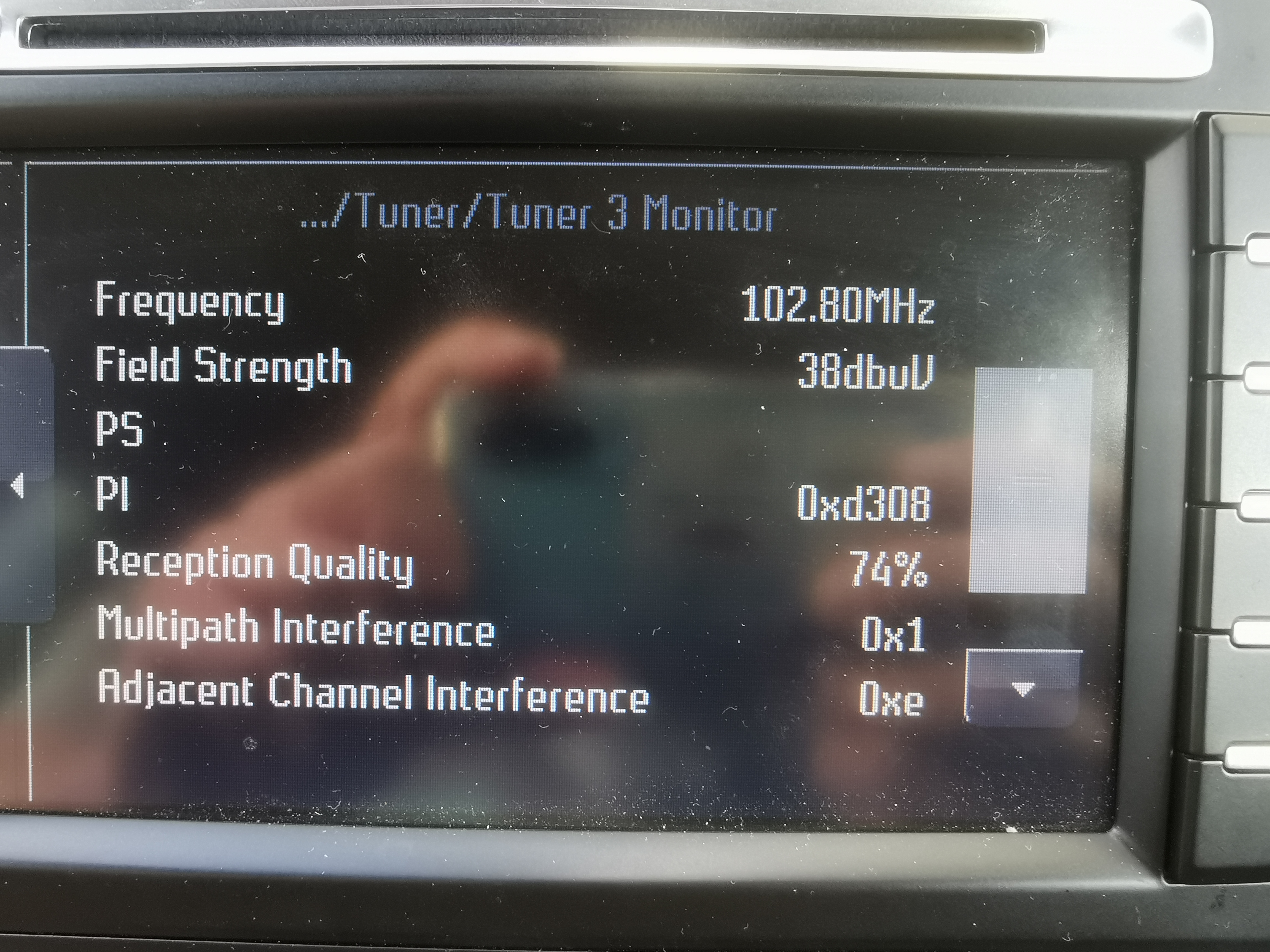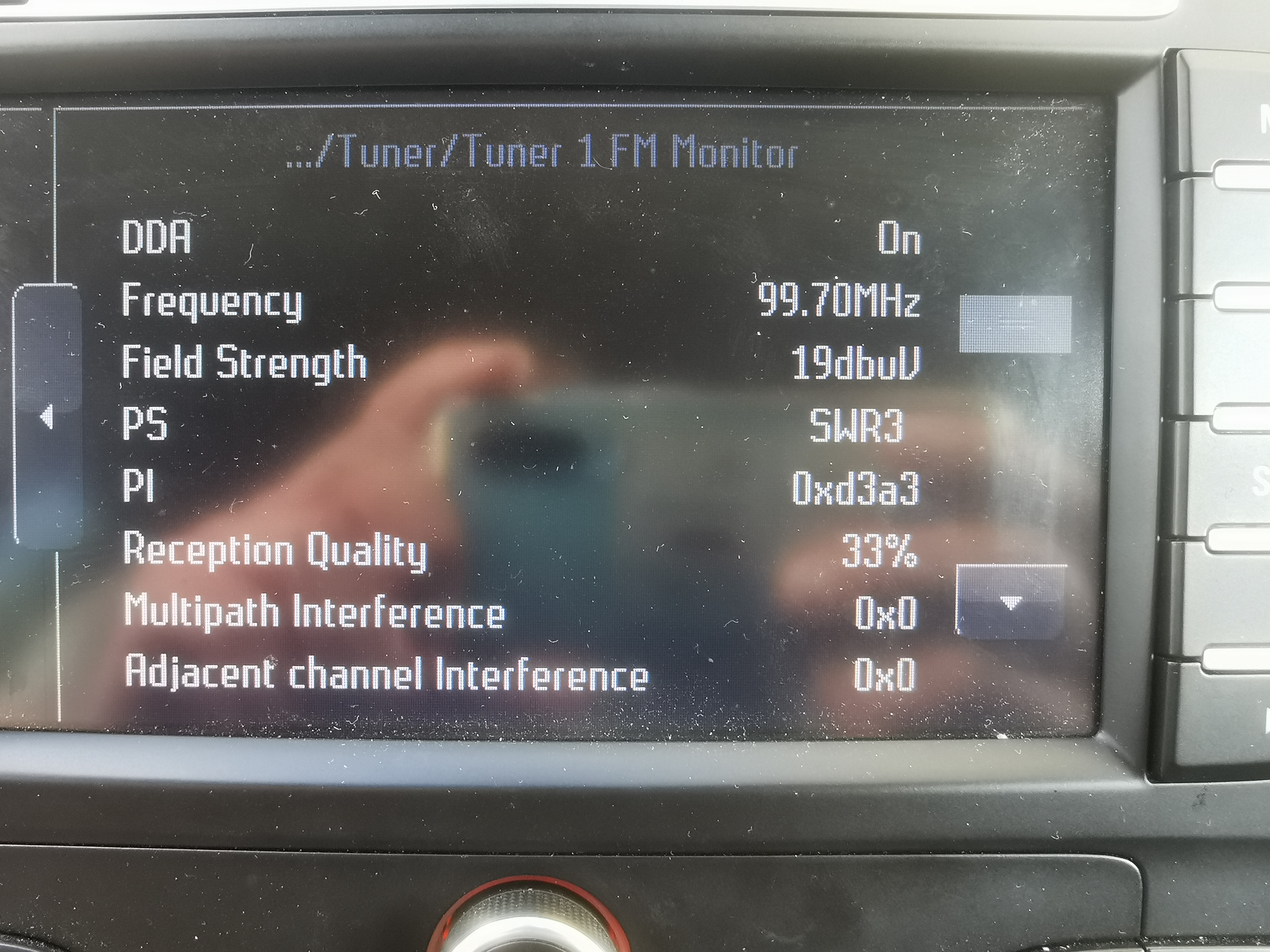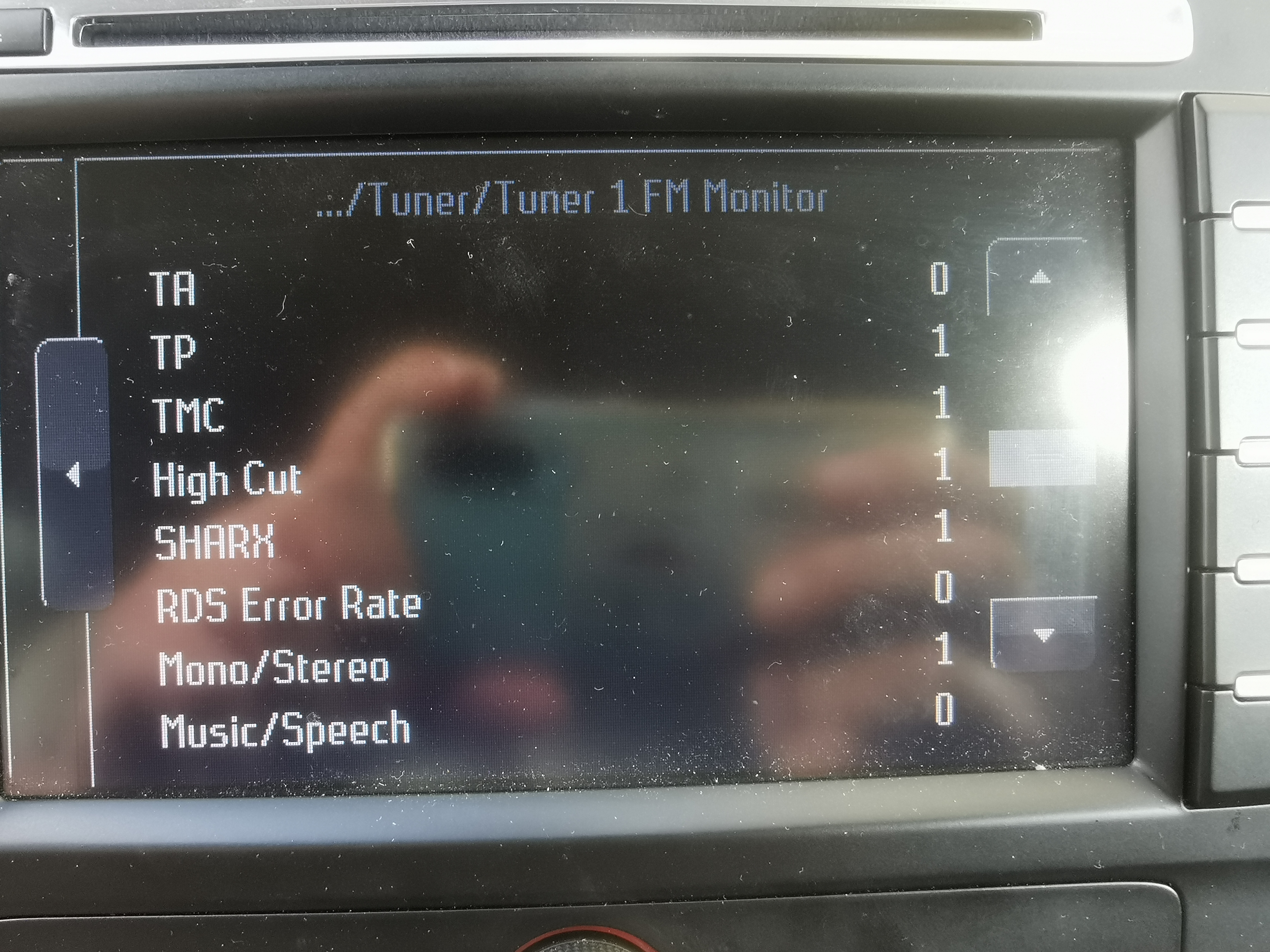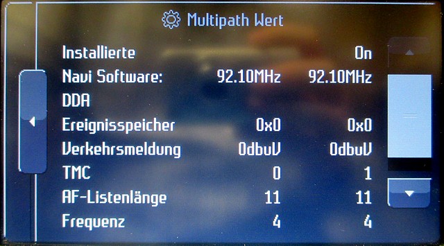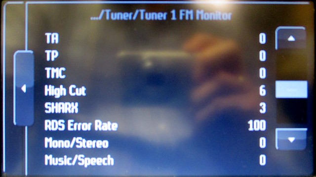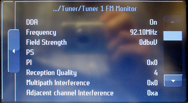 Ich habe damit noch keine Erfahrungen gesammelt, aber im MCA gibt es div. Test-Parameter im Engineering-Mode für das Radio. Diesen erreicht man durch gleichzeitiges drücken und loslassen der Tastenkombination CLIMATE + HOME + CD/AUX. Dort dann den Menüpunkt "Tuner" wählen und man kommt dann in die Parameter für "Tuner 1" und "Tuner 2". Hier mal ein Beispiel von Tuner 1 FM Monitor ohne angeschlossene Antennen: