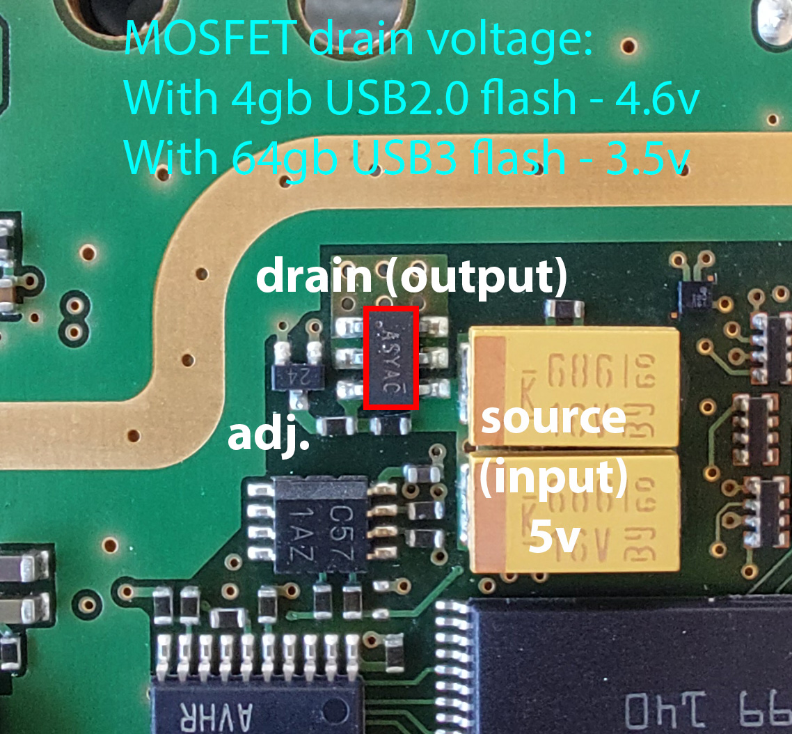 After that, I disassembled the audio module and found that the parameters of the power supply circuit of the USB port are far from normal: the supply voltage varied within very large limits, depending on the connected drive. As you know, if the USB supply voltage is below 4.7V, then the device turns off. A 4GB flash drive worked just at the limit. The rest of the flash drives lowered the voltage even more, so they were not even detected by the module.
