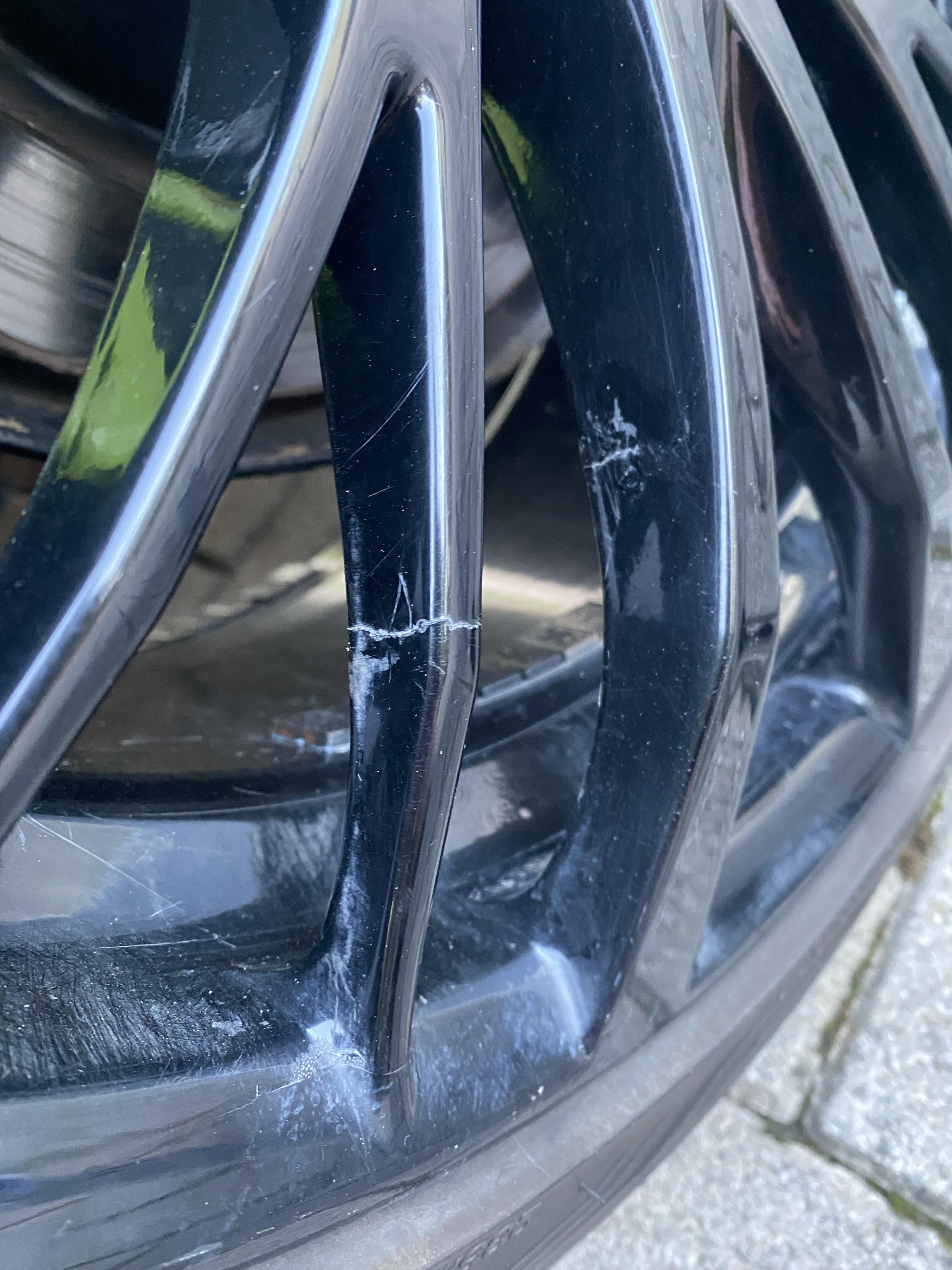Durchgebrochen!! Vor ein paar Wochen habe ich erst einen großflächigen Abrieb an der Felge gesehen und dachte mir, wieder so ein Arsch beim einparken an meine Felge gefahren. Aber ich denke sie hat einer heftig gerammt. Und jetzt habe ich erst durch die Aluoxydation das gesehen,