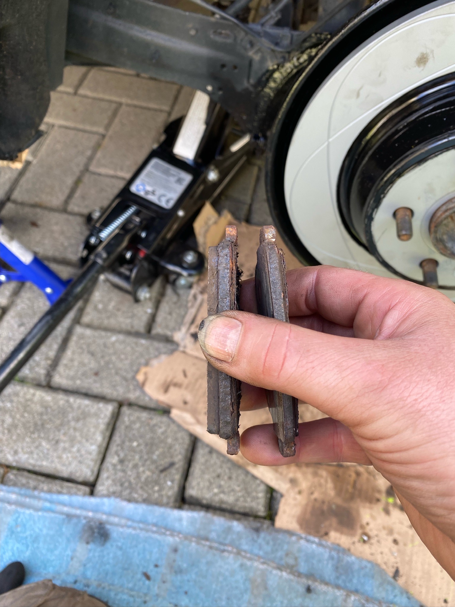 Weiter gehts hier. Scheixe Wetter gewesen und als mit den Bremsen rumgefahren. Nach 600km war Schluss und nur gequietscht. Also heute raus das Zeug. War warm genug, weil ja noch ein bisschen Rostschutzmittel und Bremssattel.ach neu muß. Aber seht selber. Ach ja Fehler wurde gefunden. Bremsbelag außen sehr gut und innen weg