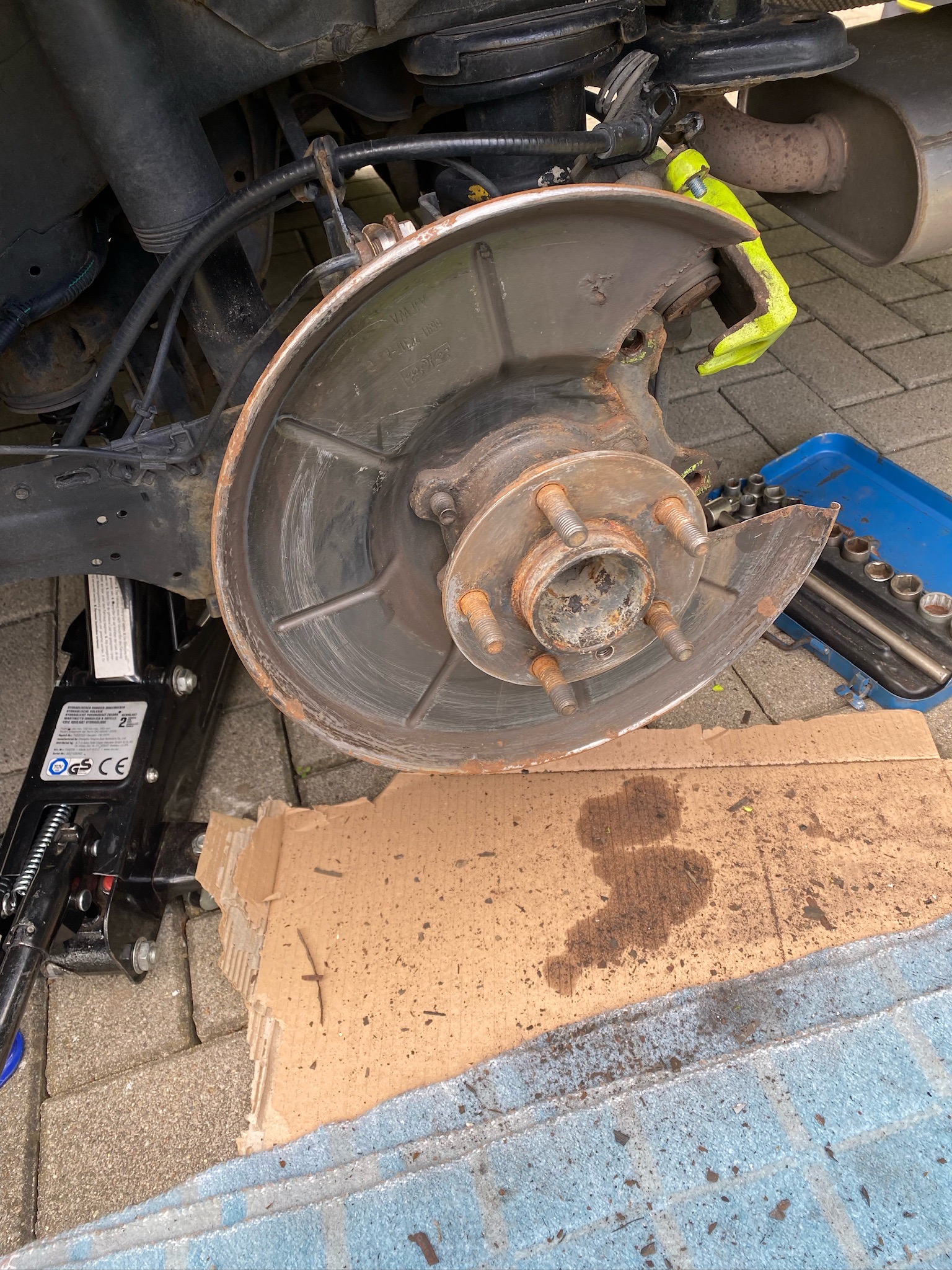 Neue liegen schon da. Mußte alles neu kaufen. Sind erst 2 Jahre alt. Sind Ate PowerDisc mit KeramikKlötze. Ich hatte schon vorne die Probleme mit den Teilen. In die KeramikKlötze arbeitet sich alles mögliche rein und schleift sich schön in die Scheiben. Und das ist das Resultat. Jetzt habe ich normale Klötze wieder.