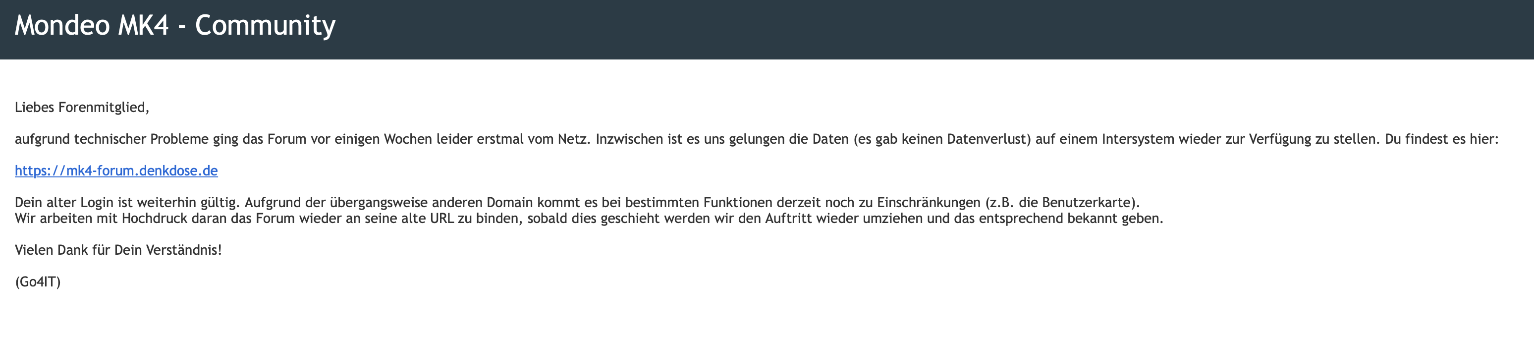 Um dies auszuschließen, müsste man allerdings eine Sondervereinbarung mit den Nutzern des Forums abschließen, in dem sich die Nutzer explizit bereit erklären, dass die hinterlegte E-Mail Adresse benutzt werden darf, um über die technischen Neuigkeiten und die verschiedenen Domains zu informieren - und dass ihre Einwilligung auch für eventuelle neue Domains desselben Forums gilt. Das kann man problemlos in den AGBs verankern - bei einer Neuanmeldung. Aber die bestehende Nutzerbasis hat dem nicht zugestimmt. Und das weiß jeder, der die jüngste Kommunikation gesehen hat. Der Login ist leider mit der E-Mail Adresse verknüpft.