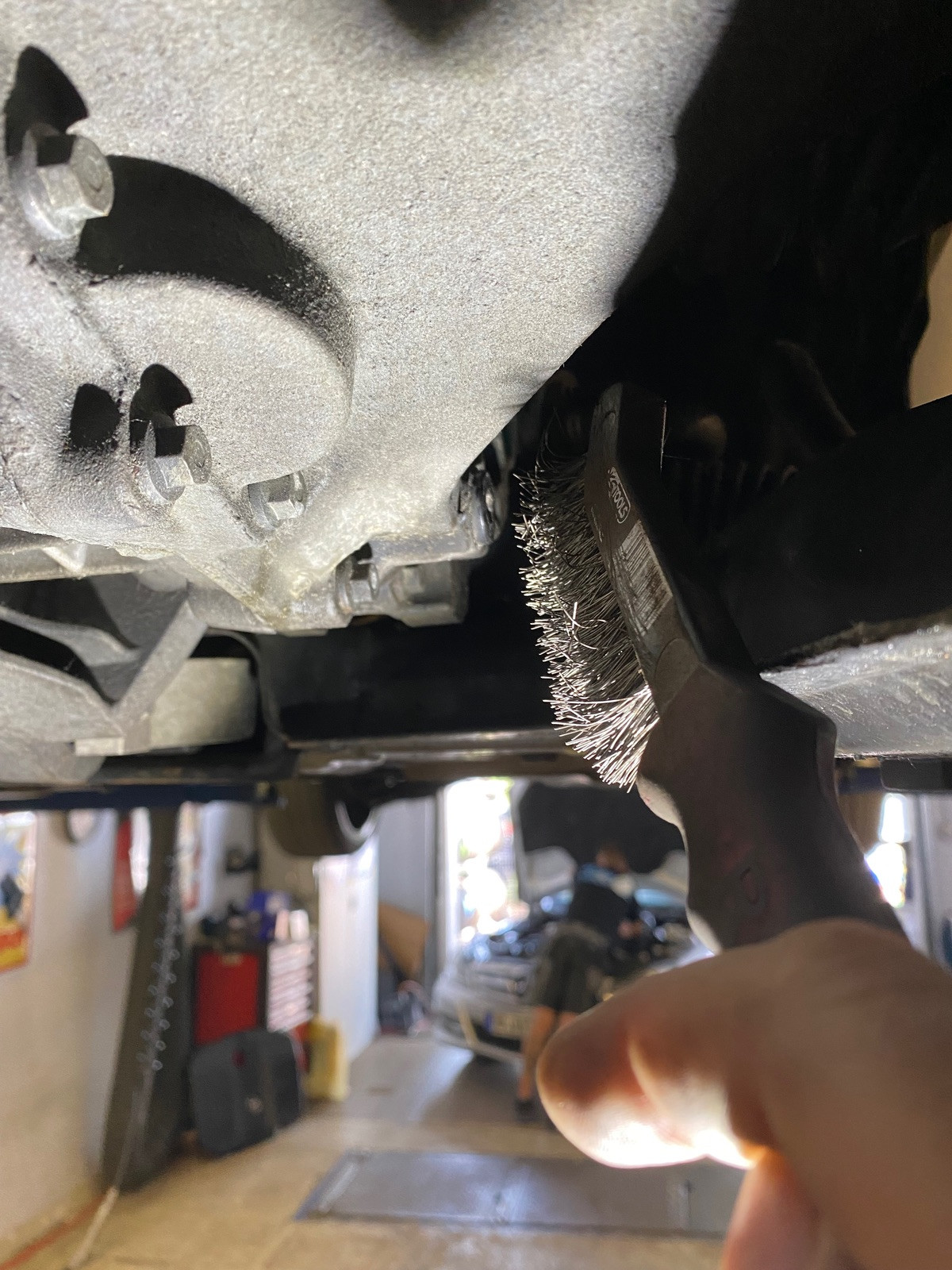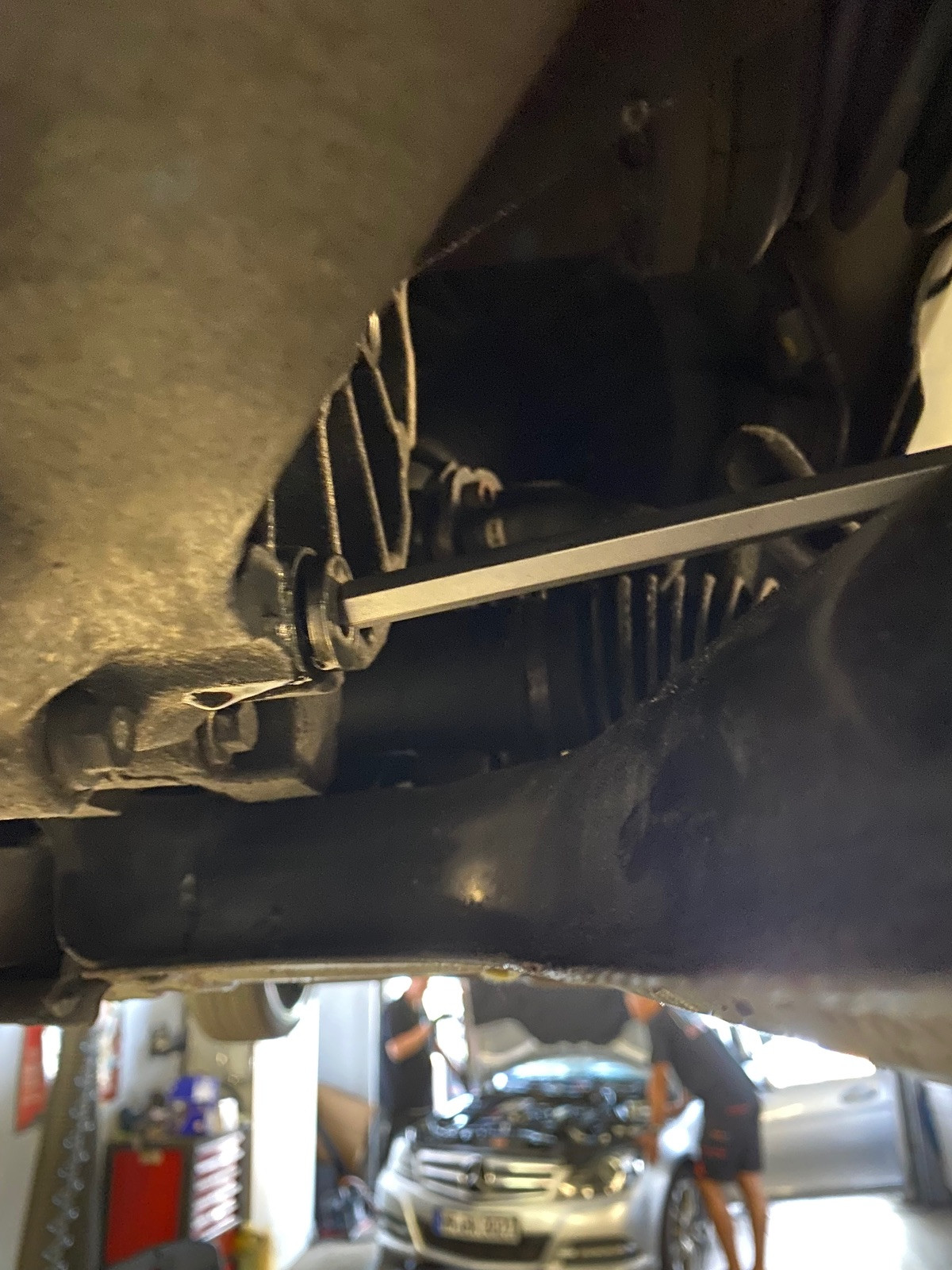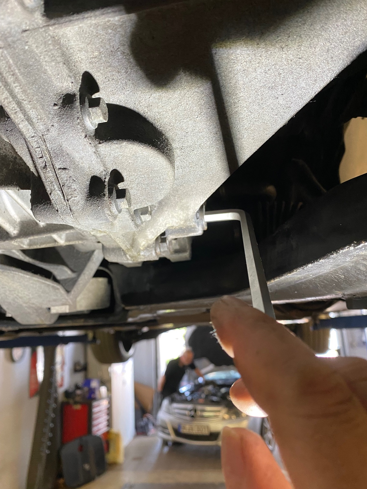- vor dem Auto stehend rechts sind beiden Schrauben, also Einfüll- und Ablaßschraube leicht sichtbar an der Außenseite des Getriebes