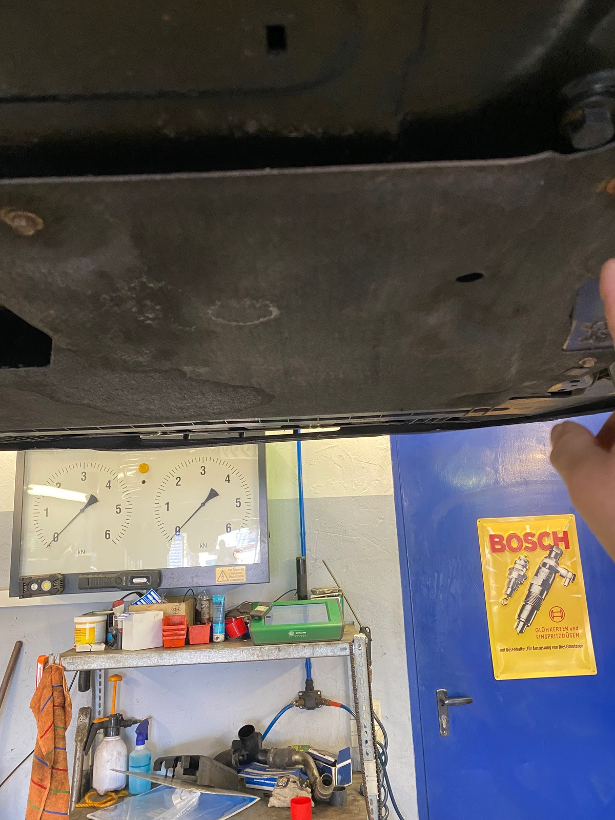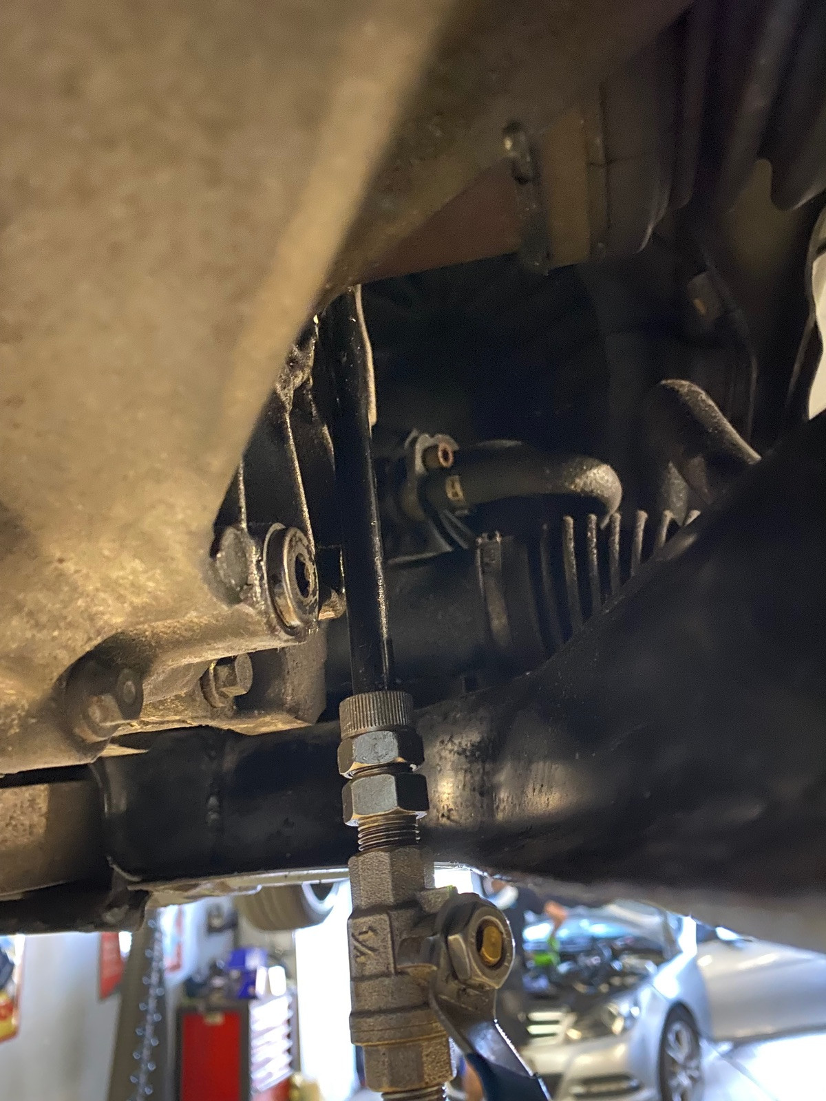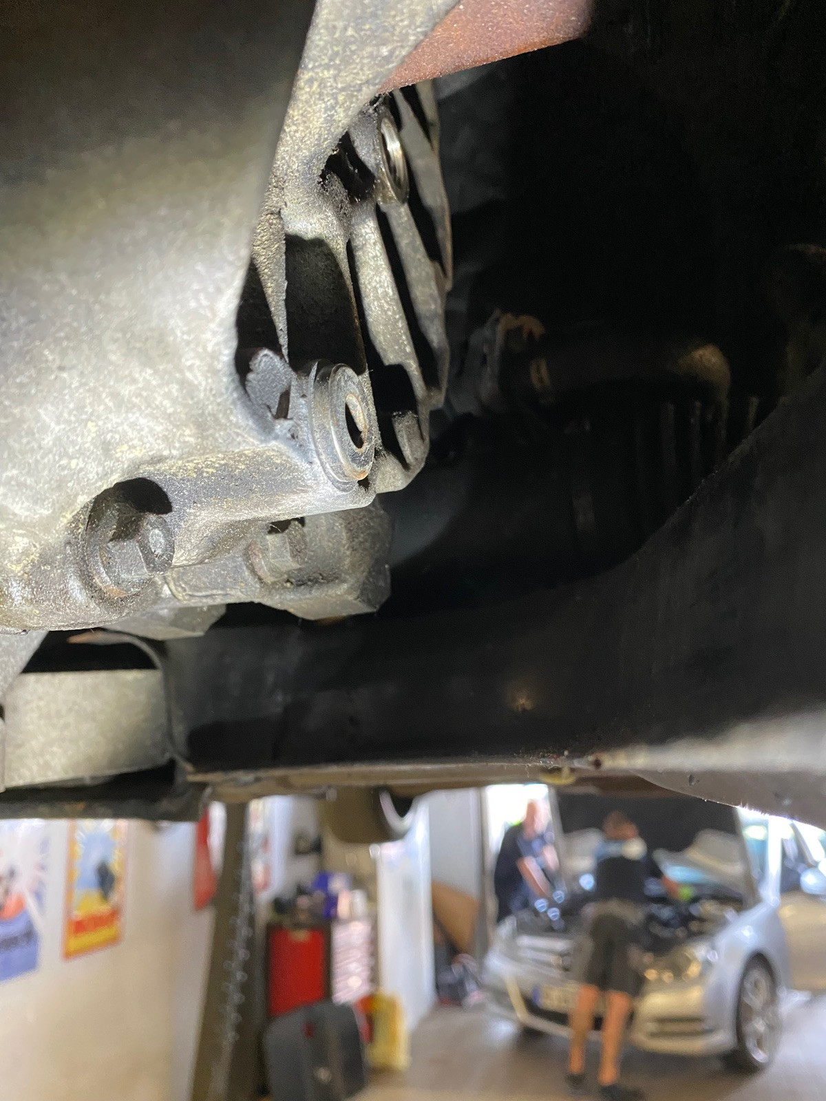 - vor dem Auto stehend rechts sind beiden Schrauben, also Einfüll- und Ablaßschraube leicht sichtbar an der Außenseite des Getriebes