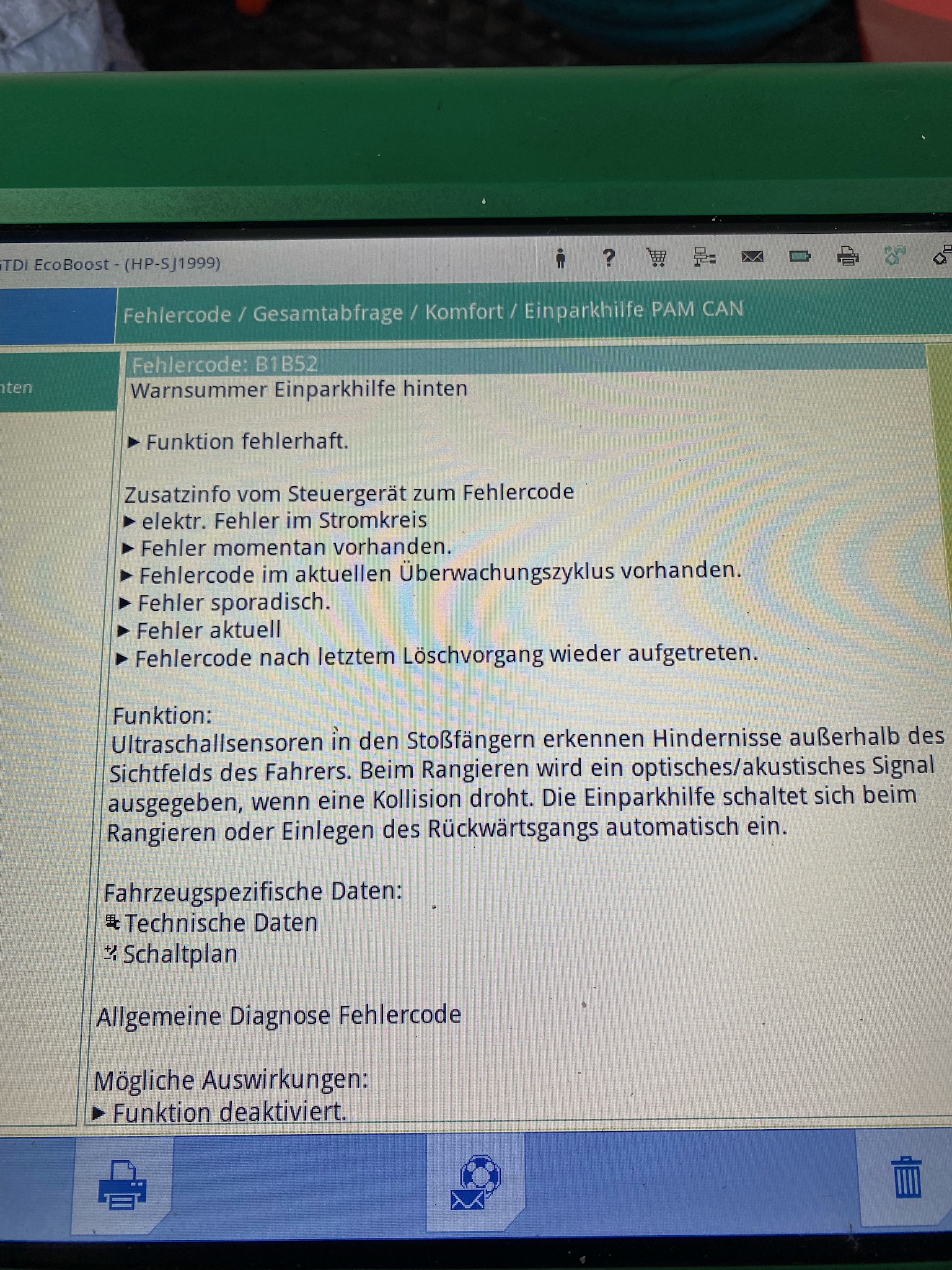Angezeigt wurde der Fehler im PAM als DTC B1B52:01-28 Signaltongeber hinten Fehler.