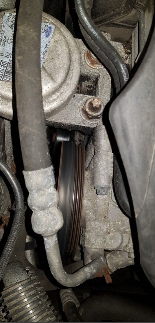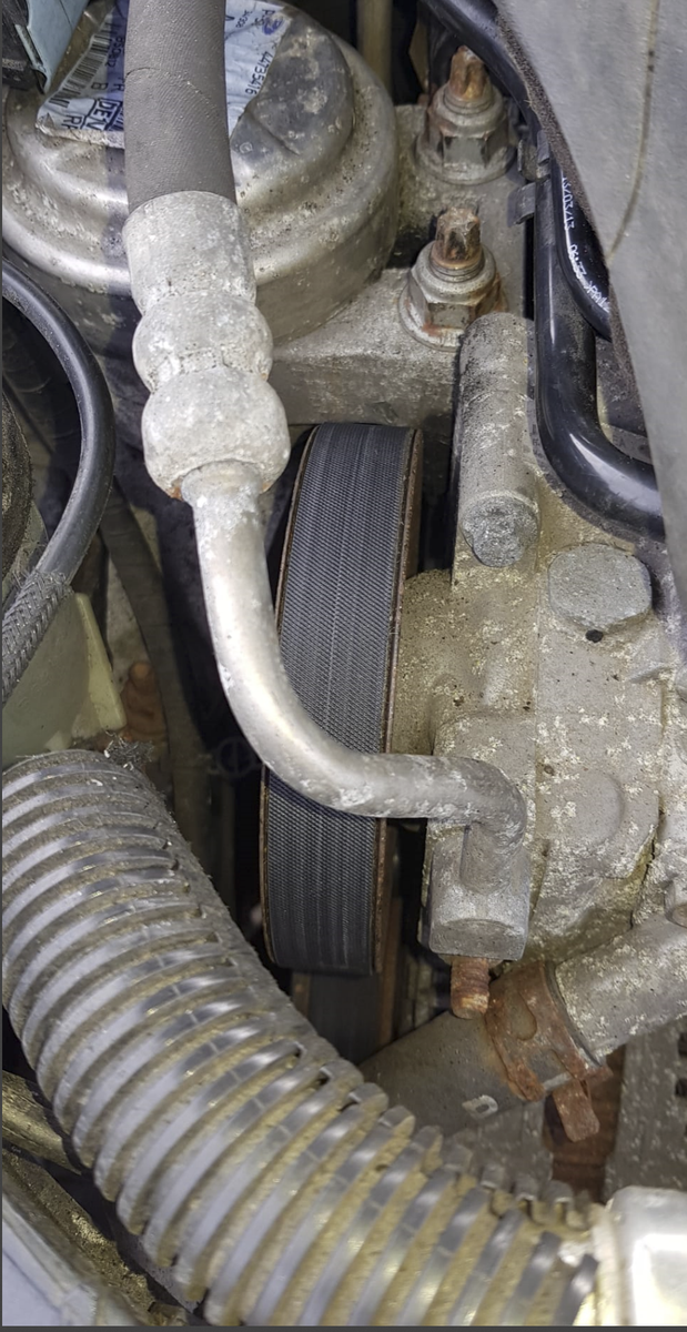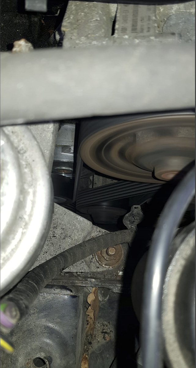 Der fehlende Rest des Keilriemens hat sich in Form von Plastikgranulat verteilt - der Riemenspanner muss sich gelöst haben, der Riemen schleift am Spanner