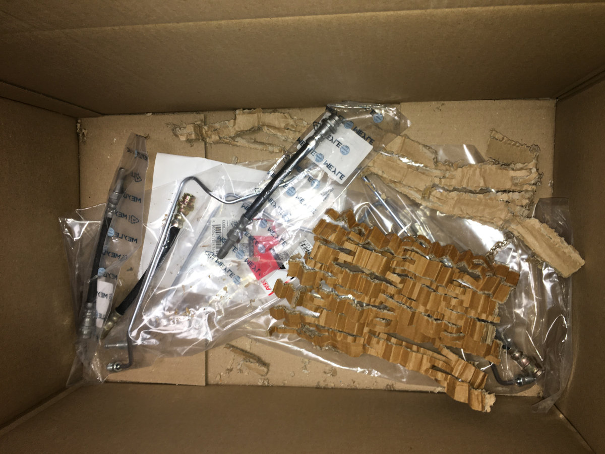 Bei der Reparatur meiner hinteren Bremsen habe ich bemerkt, dass die Bremsleitungen und Schläuche teilweise ziemlich vergammelt sind. Daher habe ich vorgefertigte Leitungen bestellt und wollte die eigentlich jetzt am Wochenende einbauen, aber irgendwas ist ja immer...das Paket war ziemlich groß (ca. 45 Liter Volumen) und randvoll mit geschredderter Pappe gefüllt. Ganz unten am Boden lagen die Bremsleitungen: