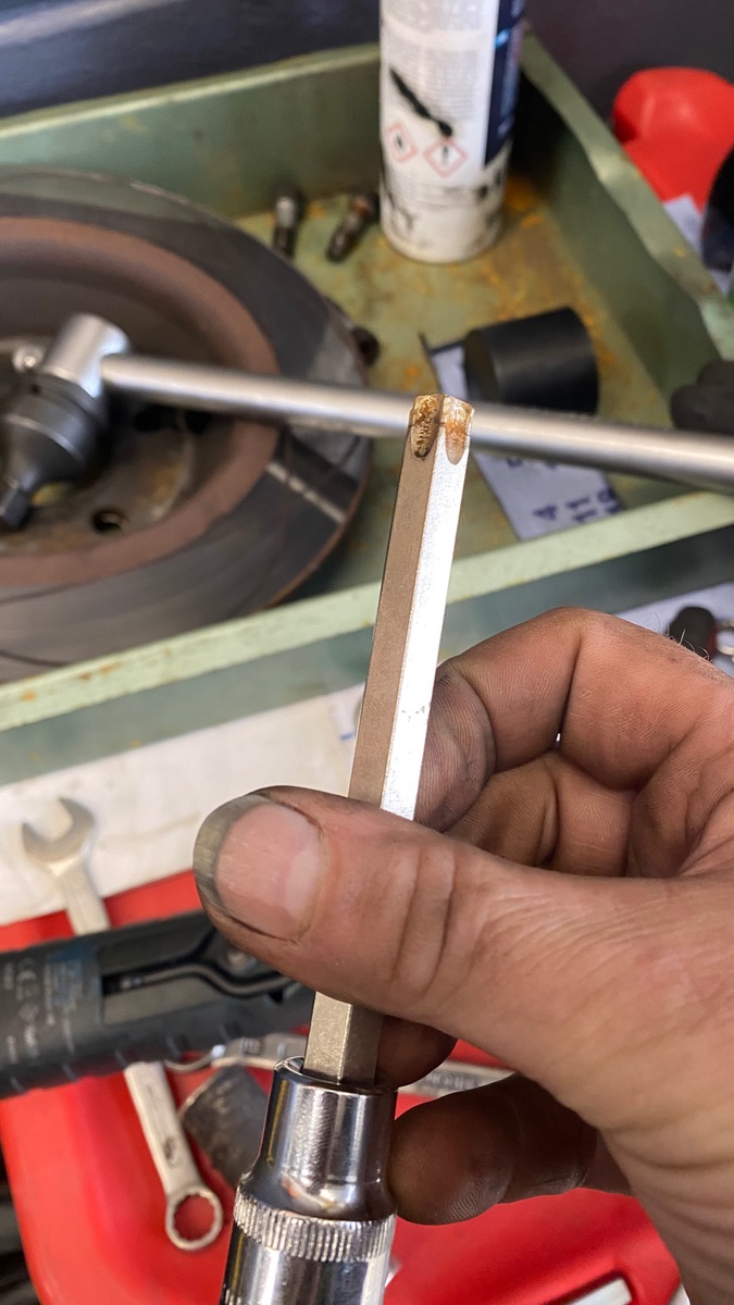 - 13er Ring ansetzen und 17er Gabelschlüssel gegenhalten, Bremssattel runter
