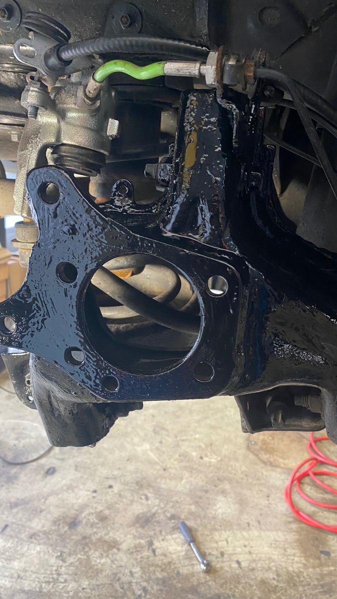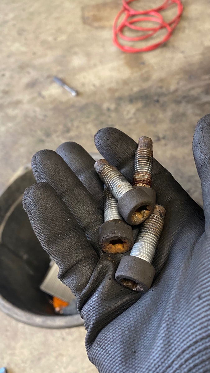 - jetzt von hinten mit einem Torx und großer!!!!Ratsche die Schrauben anlösen. Ich habe danach einen Schlagschrauber genommen und stückchenweise rein und raus mit der Schraube, bis sie richtig rausgehen . Und vieeeeeeel Rostlöser