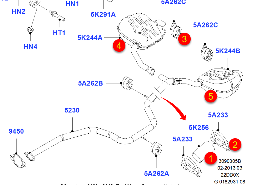 Dazu muss das Endrohr an der gezeigten Position (roter Pfeil) aufgeschnitten werden. Um es wieder zu verbinden (ohne zu schweißen) verwendet man die Muffe (1) mit den Schellen (2).