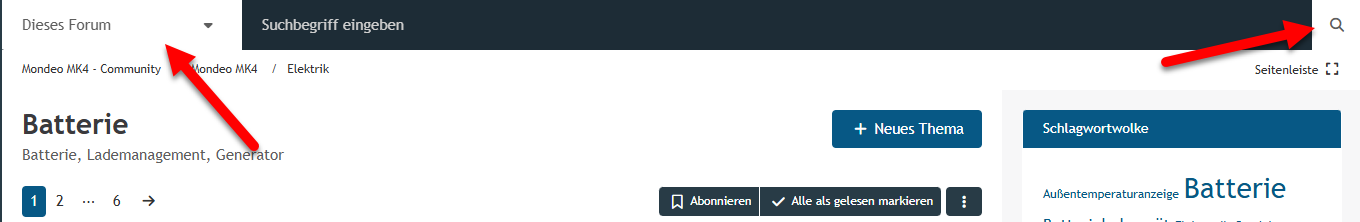 Die Forensuche ("Lupe") sucht standardmäßig immer "abwärts" in dem Bereich in dem man sich befindet. Das zeigt der Dropdown "Dieses Forum" an: