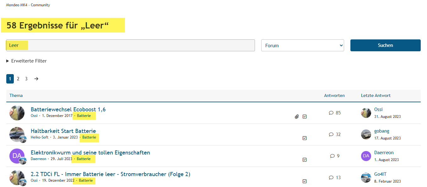 Gibt man hier einen Suchbegriff ein und drückt ENTER, erhält man nur Ergebnisse aus dieser Rubrik, wie hier am Beispiel zu erkennen ist: