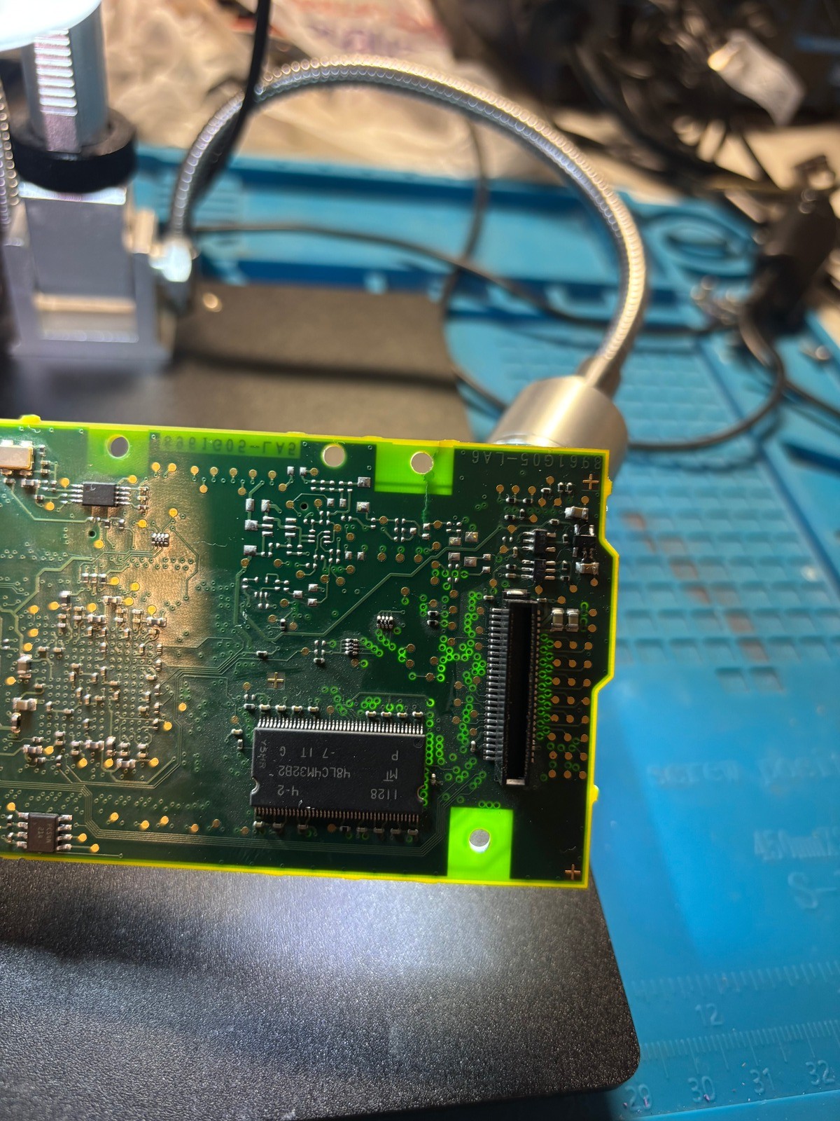 Ich habe eine Grafikkarte von einem MCA mit einem großen Riss auf der Oberseite, wie auf dem beigefügten Foto zu sehen ist. Eine Leiterbahn in der mittleren Schicht ist gebrochen. Die Karte ist komplett tot, daher vermute ich, dass diese Leiterbahn mit der Stromversorgung zusammenhängt. Kann mir jemand sagen, welche Pins diese Leiterbahn verbindet (vielleicht anhand eines Schaltplans)? Da die Reparatur der Leiterbahn selbst unmöglich erscheint, muss ich eine externe Brücke bauen.