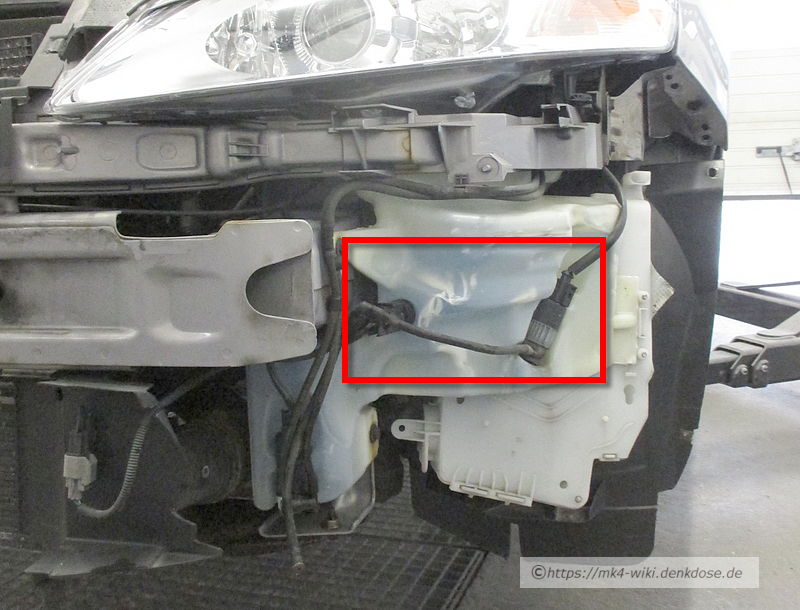 Das schaut dann da so aus (der rote Rahmen zeigt NICHT die defekte Pumpe sondern die von der Scheinwerferreinigungsanlage, die Wischwasserpumpe ist vom Rahmen aus gesehen unten links! Ich hatte grad kein anderes Bild zur Hand)