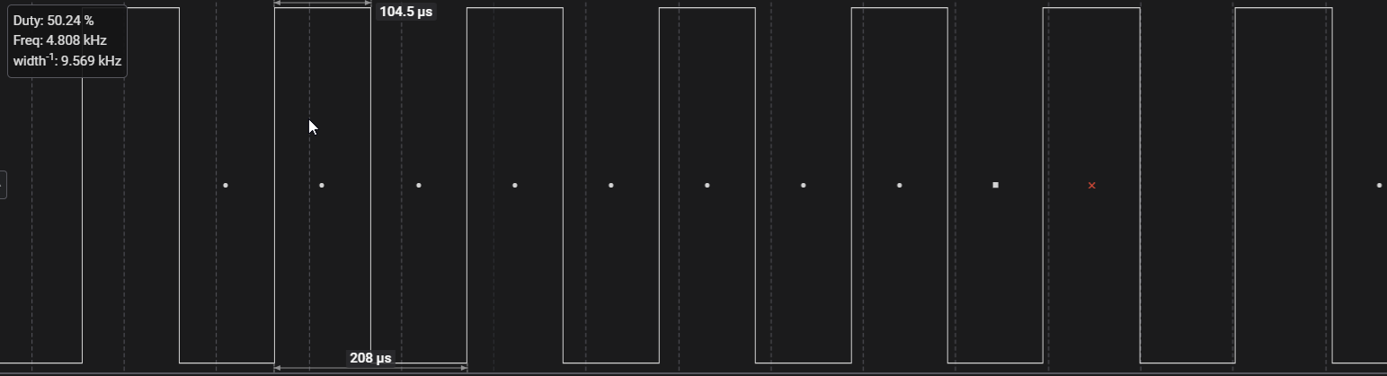 Mit 2M/s aufgezeichnet ergibt sich eine Bit-Zeit von 104,5 µs, was nach der Formel Baudrate = 1 / Bit-Zeit in s eine Baudrate von 9.600 ergibt. Das ist schon etwas ungewöhnlich, da LIN standardmäßig 19.200 Baud benutzt, gut das ich nachgemessen habe! LIN nutzt 8N1, also 8 Daten-Bits (das LSB zuerst), kein Parity-Bit und 1 Stopp-Bit. Nie mit angegeben aber immer enthalten ist auch ein Start-Bit. Ein LIN-Frame, die kleinste Informationseinheit also, besteht aus insgesamt 10 Bits.