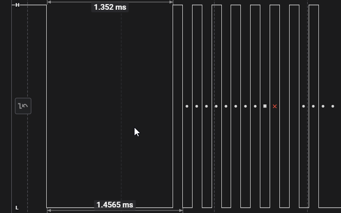 Das BREAK ist (mind.) 13 Bits lang und besteht als 0-Bits (Leitung wird auf LOW gezogen). Im gemessenen Signal ist es 1,352 ms lang (13 * 104 µs):