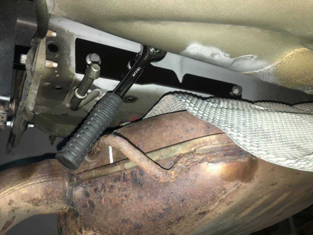 Mit meiner anderen Umschalt-Knarre von Wisent konnte ich die Schrauben dann doch noch reindrehen. Für die beiden Schrauben auf der linken Seite habe ich den Endtopf ein Stück weit unter den Hohlraum für die Anhänger-Kupplung gedrückt, so dass die Knarre gerade so an der festgeschweißten Halterung am Enttopf vorbei passt. Mit der Pendelbewegung zwischen Endtopf und oberer Halterung schafft man zwar auch nicht mehr als die 1 bis 2 Klicks, die man bei horizontal angesetzter Knarre schafft, aber man kann unter dem Fahrzeug liegend viel entspannter Arbeiten: