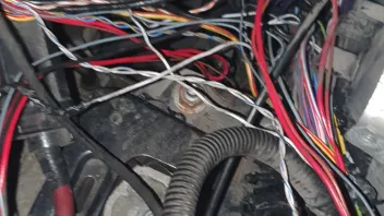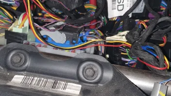 Im Hintergrund erkenne ich einen GSM-Empfänger für eine Webasto-Standheizung (ThermoCall) mit lila Fakra-Stecker. Dazu könnte der rest gehören, die rote, schwarze und gelbe Ader (Strom und W-Bus) sowie rechts das glänzende schwarze Kabel (Antenne?). Das dicke rote ist noch seltsam. Allein die Stelle zeigt das jemand zusätzliche Leitungen in den Motorraum brauchte und dort einen Durchbruch gemacht hat. Das dicke rote könnte für eine Zusatzendstufe (gewesen) sein?