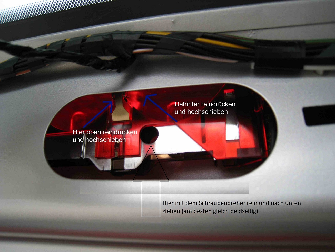 Die Spangen, die die Bremsleuchte halten, lassen sich aber auch einfacher lösen. Man muss nur die komplette silberne Halterung für die Leuchtmittel (ein anderer Begriff fällt mir gerade nicht ein) entriegeln. Mit einem Schraubendreher einfach in das runde Loch neben der Spange rein und dann nach unten ziehen. @ AK-Shadow: Ich habe es mal in Dein Bild reingezeichnet