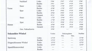In der Ausgangsvermessung steht bei Nachlauf 20° ein Wert von +8°10´bei einem Sollwert von 2°59´mit 1°02´Toleranz- also jenseits von gut und böse...