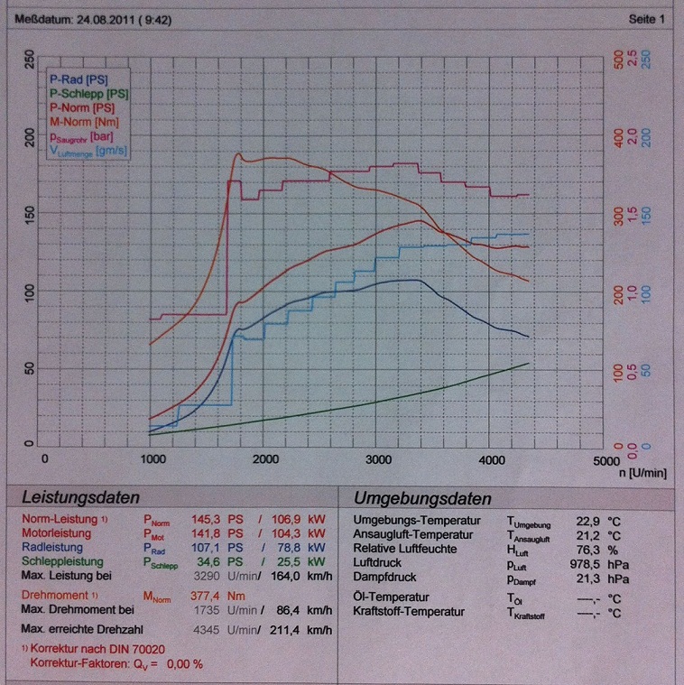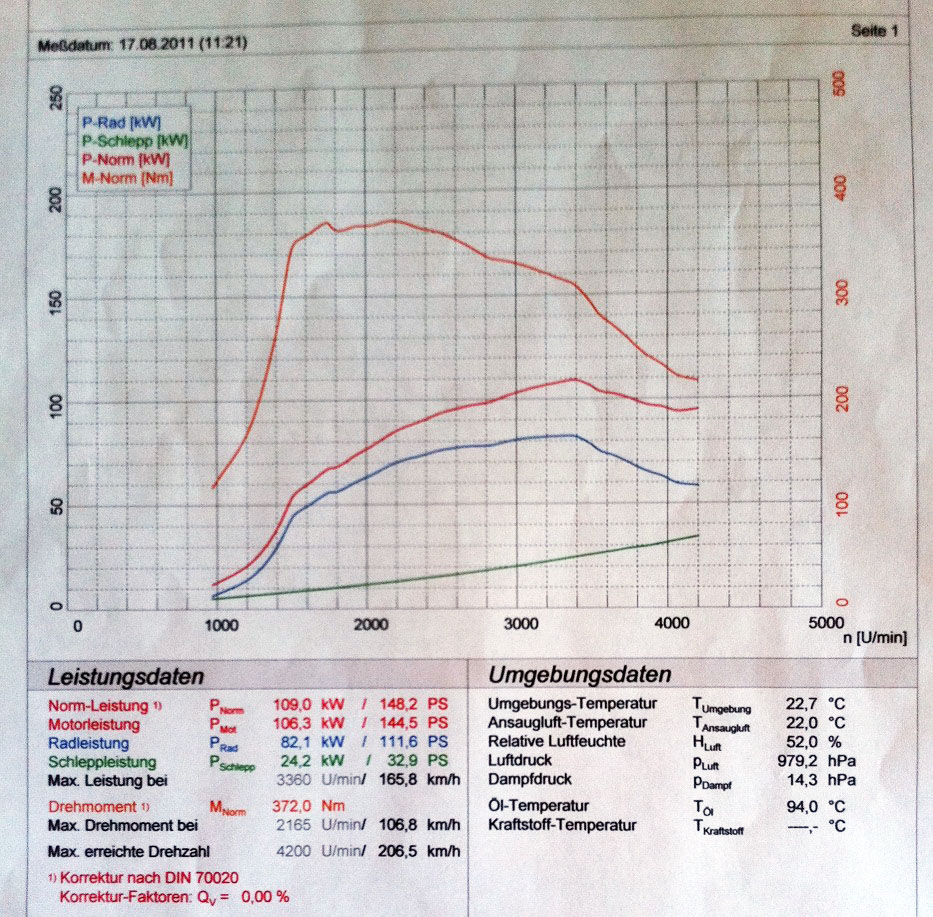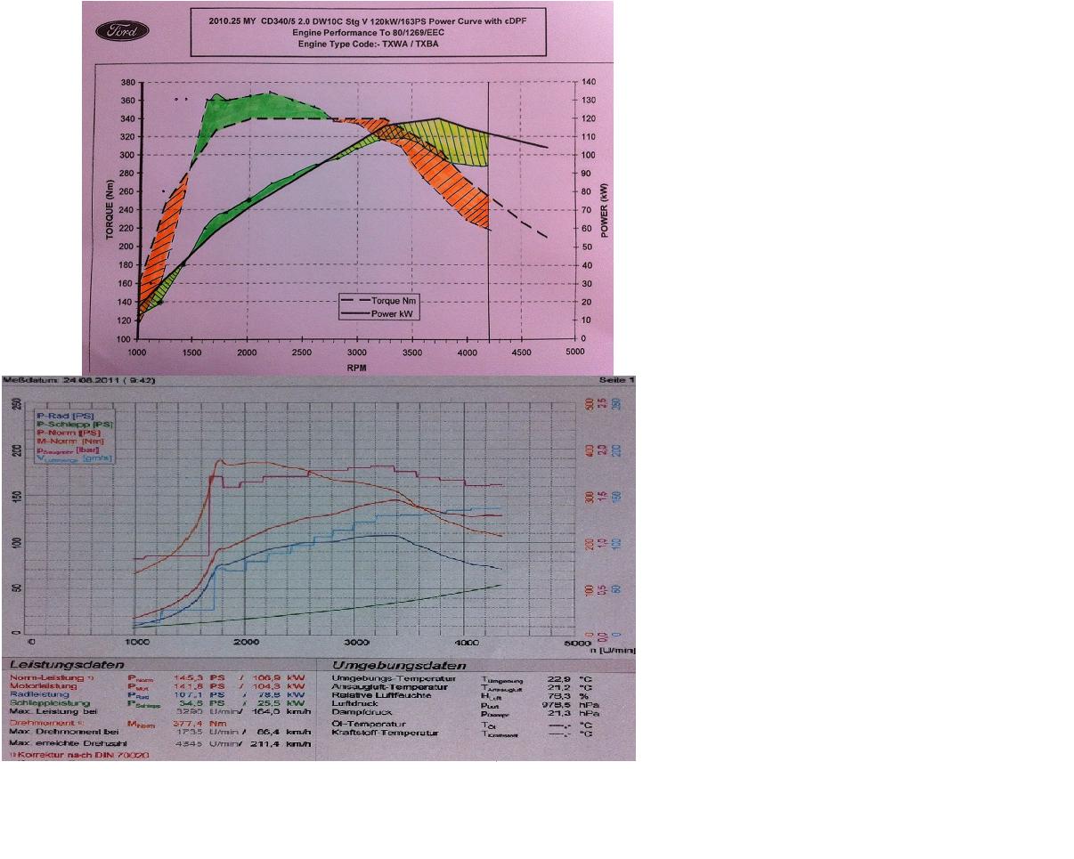 Anbei 2 Messungen meines Mondeos (TDCI EU5 120kW). Die erste von letzter Woche, die zweite jetzt nach Werkstattaufenthalt, wo als Reparaturversuch bzgl. der Minderleistung der Partikelfilter gereinigt wurde (war angeblich stark zugesetzt). Außerdem wurden via Sensordaten überprüft: Kompression ist i.O., Einspritzventile sind i.O., Rücklauftest i.O., Kraftstoffdosierventil i.O., Niederdruck Dieselkraftstoffsystem i.O., Turbolader i.O. (wobei hier wohl "dreht" als ausreichendes Merkmal betrachtet wurde, was ich etwas anders sehe).