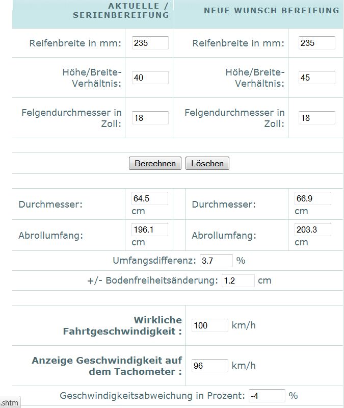Ob man mit dieser Argumentation andere Reifengrößen eingetragen bekommt? Die Berechnungen kann der Prüfingenieur auch durchführen.