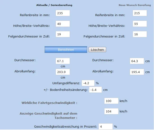Andersrum: Wenn der Tacho bei 235/40R19 genau ginge, zeigt er bei 215/55R16 4% zu wenig an. Denn das Rad mit der 19" Felge hat den größeren Umfang, macht bei gleicher Drehzahl die höhere Geschwindigkeit.