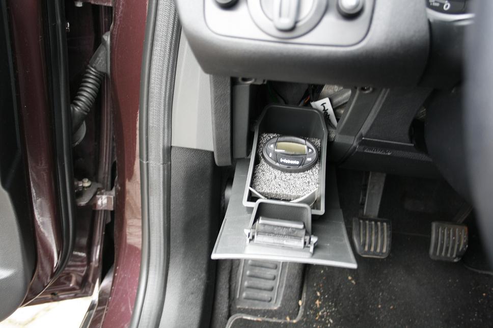 In dem Staufach links vom Lenkrad (Zugang zum OBD-Stecker) wurde ein PU-Klotz nach meiner Anweisung eingepasst.