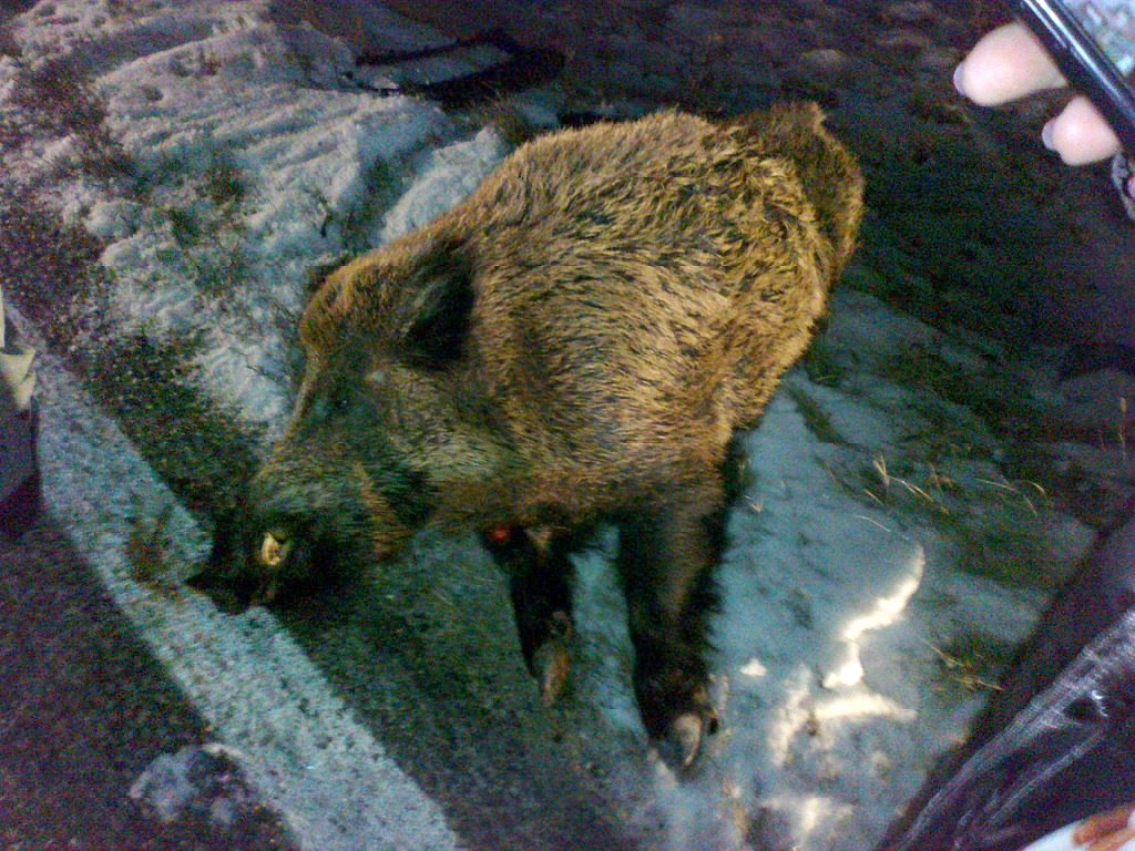 Es war Dienstag spätabends 22h, trockene Landstrasse 2 km vom Haus entfernt im letzten Waldstück kam das Tier bei ca. 80kmh von rechts ansatzlos aus dem Dickicht. Ein Knall, beide Airbags offen, ja beide, denn auch die LV-Handtasche am Beifahrersitz löste ihren aus! Der dabei abgesprengte Deckel des BF Airbags zerstörte dabei die WS-Scheibe von innen, also noch ein Tausender mehr Schaden dank überfüllter Damenhandtasche. Das Wildschwein traf das Auto mittig a.d. Fahrerseite und wurde fast 30m weit auf die Gegenfahrbahn geschleudert. Direkt vor einen A3, der nachdem er über die Sau gefahren war, den Großteil seiner Frontschürze vermisste. Dann das volle Programm: geschockter Anruf "komm bitte ...mein Auto ist kaputt ..da im Wald... ruf die Polizei" Da ich an diesem Abend früher zuhause war, war ich 2Min später vor Ort. Gespenstisch still wie einem Film sah ich zuerst die Wildsau mitten auf der Strasse, dann der A3 rechts, gegenüber den in der Kälte auskühlenden knisternden kaum erkennbaren Mondeo. Die Motorhaube aufgestellt auf der Frontscheibe liegend. Aber keine Personen inmitten des auf 50Meter verteilten Trümmerfeldes! Dann erst bemerkte ich den jungen A3 Fahrer vor seinem Auto hockend auf seine Frontschürze starrend und "die ist frisch lackiert" dabei stammelnd. In der anderen Richtung im Dunkeln meine Frau mit Stöckelschuhen durch den Schnee stapfend beim Versuch ein Warndreieck zusammen zu bauen. Sie hatte sich Gott sei Dank nicht sichtbar verletzt, stammelte aber im Schock etwas von vorbeifahrenden anderen Autofahrern? Erst nachher stellte sich heraus, dass es wirklich so war, dass kein einziger der hinter meiner Frau Fahrenden angehalten hatte um zu helfen. Die schlängelten sich einfach zwischen den beiden beschädigten Autos und der Wildsau durch und fuhren einfach weiter. Da noch nie persönlich erlebt, hielt ich diesbezügliche Fernsehberichte oder gestellte Selbstversuche immer als kaum vorstellbar. Aber der Blitz soll diese Assis beim k*cken treffen, denn die sind wirklich unter uns!!!