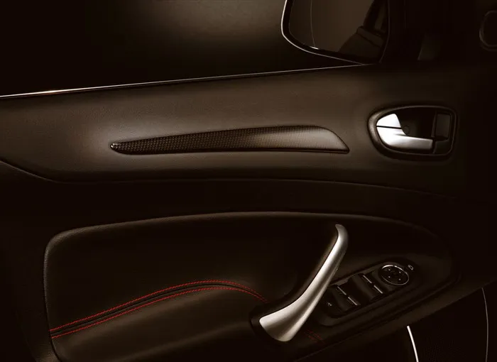 Die Leder/Alcantara Sitze und das LR haben rote Ziernähte. Mittelkonsole ist in Klavierlackoptik. Die Blenden in den Türen und die Leiste an der Beifahrerseite des Armaturenbretts sind in Carbonoptik. Die Pedalerie hat Aluauflagen.