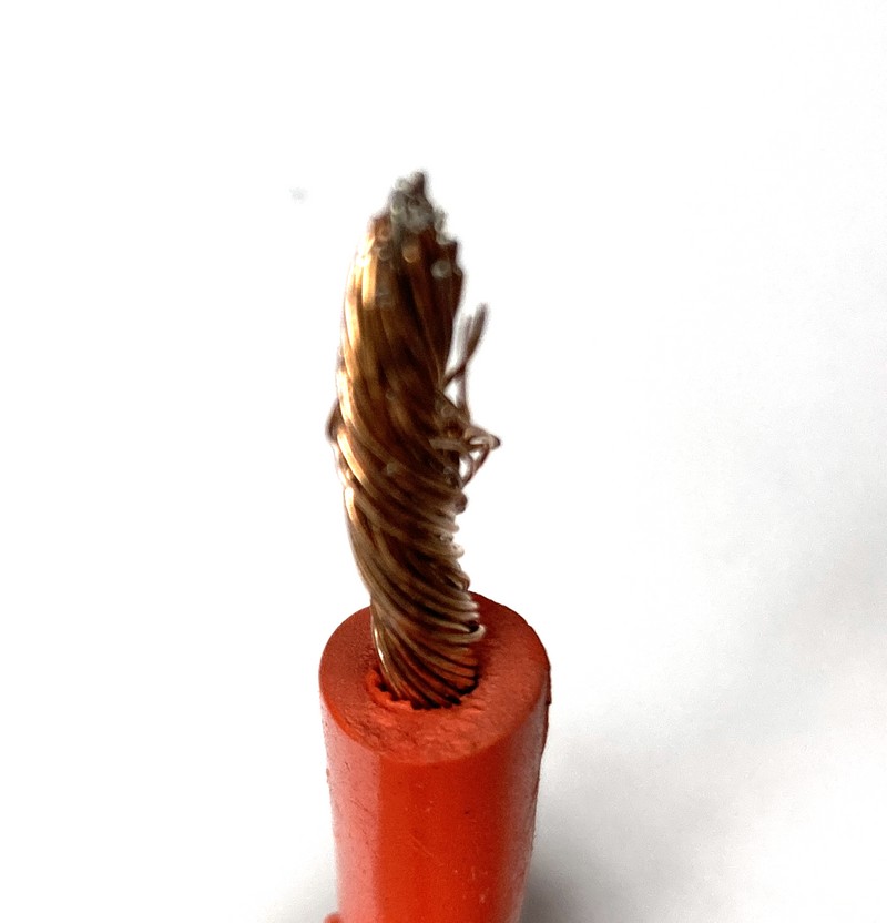 Mal ein Negativbeispiel, das von mir gekaufte Starterkabel (Amazon, um die 20,- €). Angeblich 25 mm², auf den Verkaufsfotos sah es ok aus: