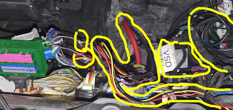Über den "offnenen" MS-CAN brauchen wir nicht reden, das gehört gerichtet! Der grüne Stecker ist der Kabelbaum zum Motorraum. Hm, vielleicht hat dort jemand eine Standheizung nachgerüstet und wollte die mit MS-CAN versorgen? Nur Spekulation...
