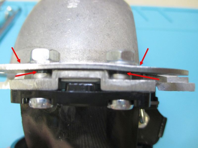 Und hier hätte zwischen Projektorgehäuse und Montageblech noch ein Abstandshalter gehört damit sich das Blech beim anziehen (selbst sanft) der Muttern nicht verformt: