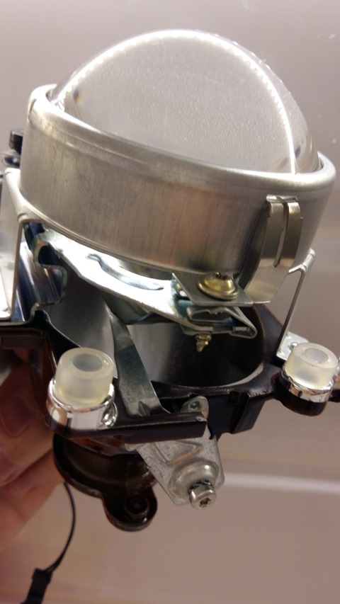 ist ja fest (über Gummi-Unterlegscheiben um die Vibrationsübertragung zu dämpfen) mit dem inneren, kleineren und frei beweglichen Teil des Chromreflektors verbunden. Die Stellschrauben am Scheinwerfer bewegen dabei den kompletten inneren Reflektor.