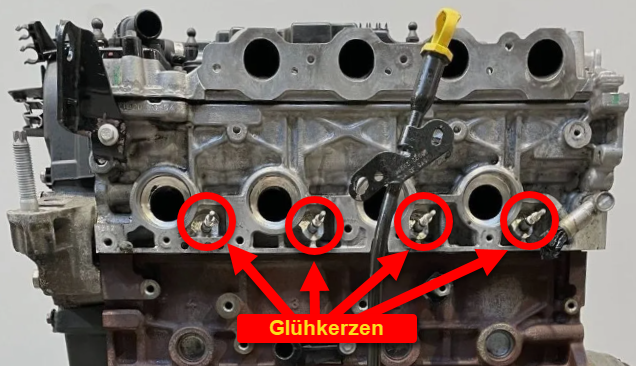 Hier auf dem Foto kann man die Glühkerzen gut erkennen, wenn die ganzen Anbauteile weg sind. Diese stehen leicht schräg nach oben: