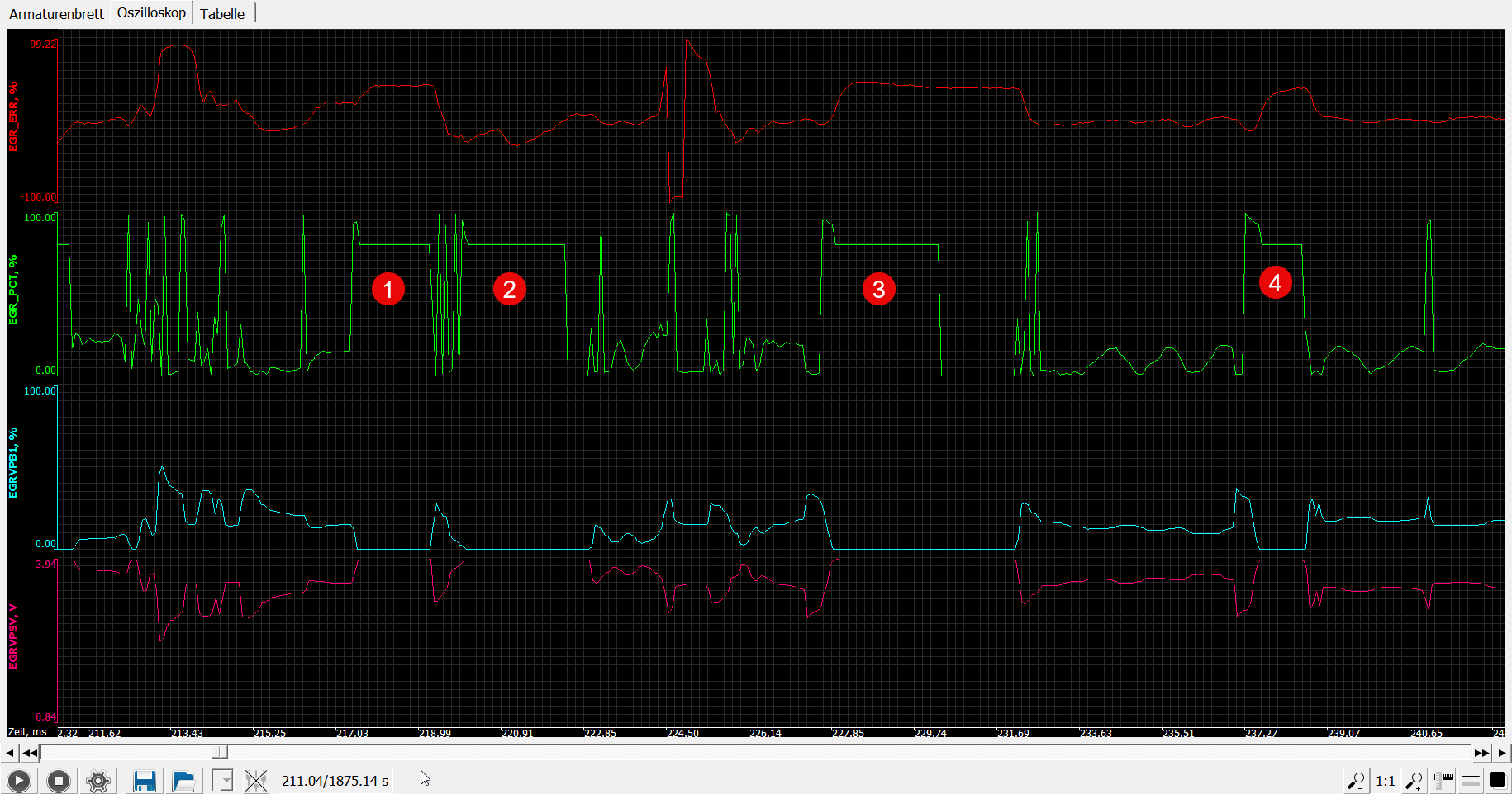Das PCM fordert mit EGR_PCT einen Öffnungswinkel für das AGR-Ventil an. An den markierten Stellen sieht es für mich so aus als wolle das PCM das Ventil aus dem vollständig geschlossenen Zustand öffnen, anfangs tut sich auch kurz etwas, aber dann klebt der Öffnungswinkel für eine gewisse Zeit fest, bis er dann doch auf macht. Der Parameter EGR_PCT ist sicher von der zurückgemeldeter Position und anderen Faktoren abhängig (Differenzdruck/MAF, usw.). Wenn das Ventil über den Poti der Anforderung nicht folgt, scheint das PCM seine Anforderung nicht mehr zu ändern, vielleicht um den Motor im AGR nicht zu überlasten? Erst wenn der Sensorwert sich wieder ändert, ändert das PCM auch seine Anforderung. Das kann man ganz gut erkennen: