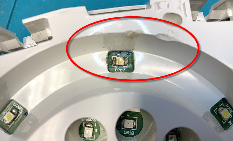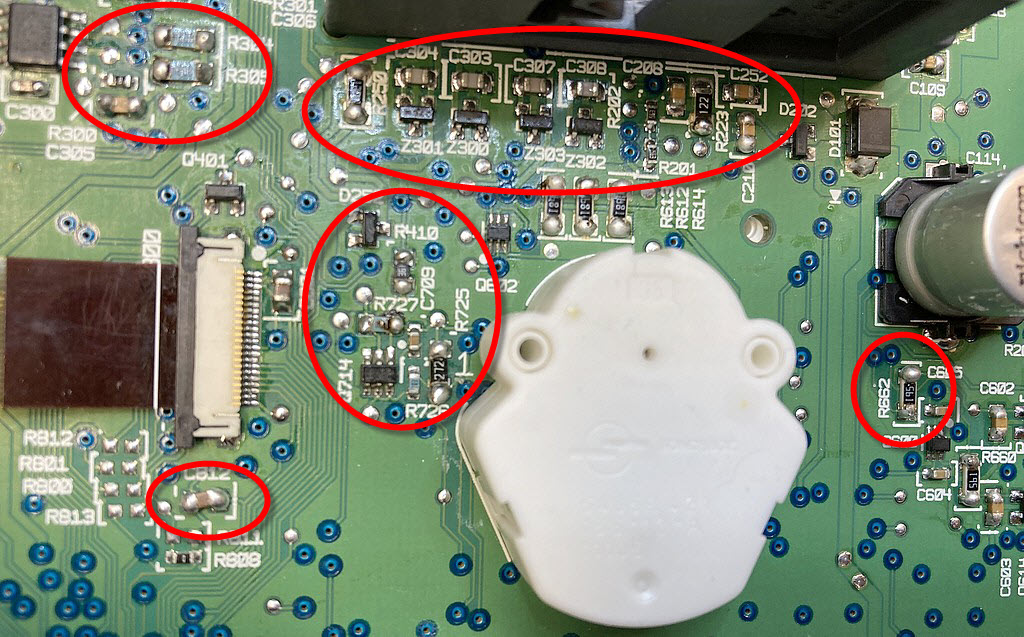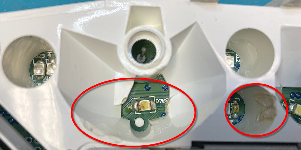 7 Stück waren defekt, alle von der Hintergrundbeleuchtung. Diese habe ich gegen originale ausgetauscht (gut zu erkennen, meine sind die ohne Lötkleckste und nicht verbrannt