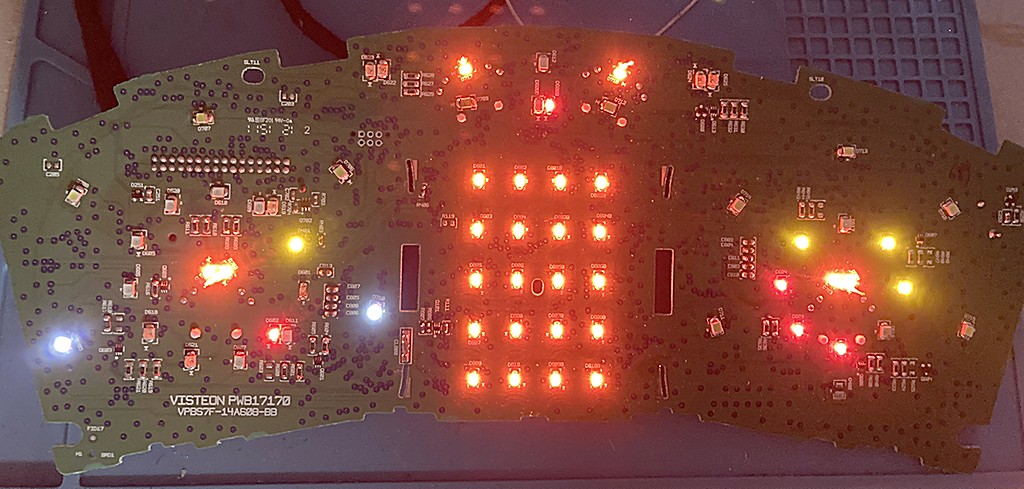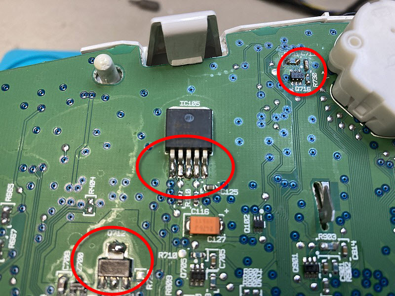 Als nächstes suche ich das Problem der nicht leuchtenden LEDs. Einige davon haben die Spezialbehandlung Deines Kumpels nicht überlebt, andere leuchten noch, wenn man sie ausgebaut betreibt. Das wird jetzt etwas "knackig" weil ich leider nur einen vFL Benziner-Tacho zum Vergleich habe und der ist nicht baugleich mit dem vom FL (andere HW-Generation), d.h. ich kann keinen links/rechts Vergleich vornehmen, muss also wirklich die Strompfade finden und kontrollieren, angefangen von den LED-Treiber ICs. Keine Ahnung wie lange ich dafür brauchen werde oder ob es mir überhaupt gelingt, denn auch wenn viele Bauteile auf beiden Tachoplatinen gleich sind, manche sind eben anders und ich müsste erst Ersatz besorgen um ein als möglicherweise defekt ermitteltes Bauteil zu tauschen. Da es in den Automotive-Modulen aber von Spezialteilen welche nur der Hersteller erhält nur so wimmelt kann das ein echtes Problem werden. Man bekommt nicht mal Datenblätter dazu. Manchmal hat man Glück und jemand weiss das die Sonderbezeichnungen einem konventionell erhältlichen Bauteil gleichen, ggf. nur in der Spezifikation automotive sind (rauhe Betriebsumgebung), aber manchmal hängt man auch vor einer Black-Box.