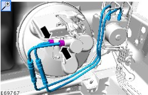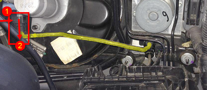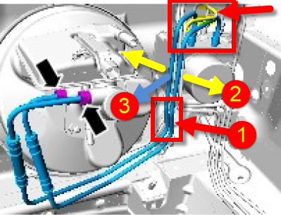 Was das Symbolbild nicht eben nicht zeigt ist, das direkt oberhalb der Leitungen Karosserieblech ist und der Platz nicht ausreicht um die dicke Leitung irgendwie da nach oben raus zu bekommen. Man muss also zuerst die Plastikführung (1) rausmachen, welche drei Bremszylinderleitungen nach oben zum Block führt und dann diese auseinanderdrücken (2) um die dicke Leitung dann in die gezeigte Richtung (3) rausziehen zu können. Das ist etwas fummelei, weil die Leitungen nur zu gern wieder in die Halter flutschen. Das ist super-schlecht gelöst von Ford an der Stelle und extrem Service-Unfreundlich.