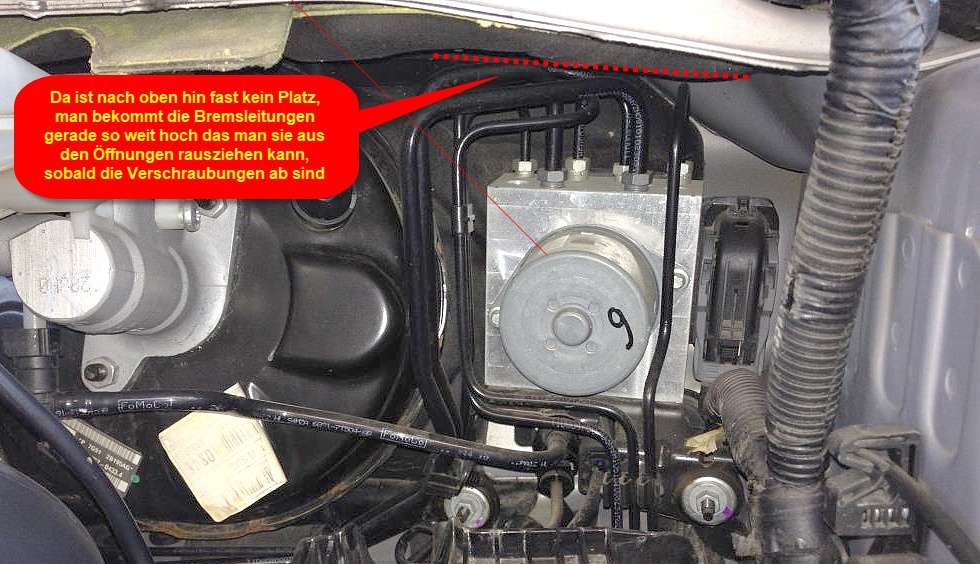 Jetzt wäre das ABS theoretisch frei, aber raus bekommt man das noch lange nicht. Wer glaubt man könne es nun einfach in Fahrtrichtung rausziehen hat die Rechnung ohne die Ford-Ingeneure gemacht! Die dünnen Leitungen für die Bremszylinder laufen gegen den Uhrzeigersinn um um die ABS-Pumpe herum und versperren somit den Weg für den Block mit Halter: